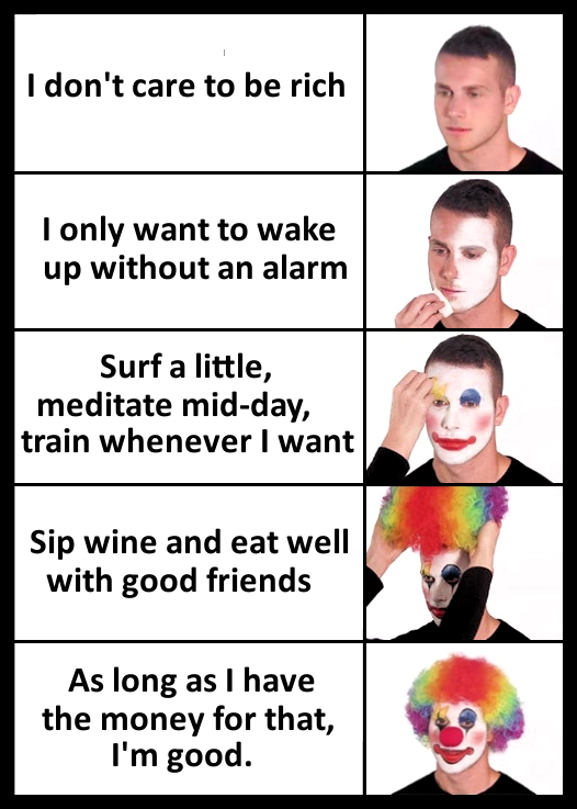 Yea, a lot of people are ragging on him, but what he's saying isnt that bad and the only reason this seems so difficult is because capitalism has made most "beach side areas" so expensive. But he basically just wants enough money to drink wine (not that expensive) and "good food" (which is super subjective. This could just mean "fresh home food" which, again, isn't expensive)
