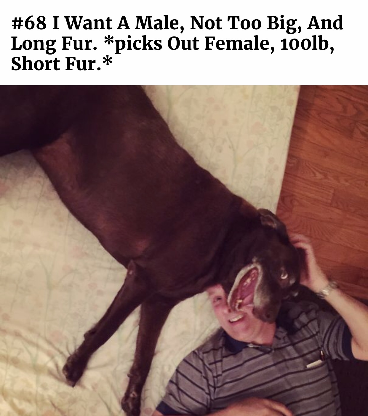 We got a dog I didn't want, I love dogs but I didn't want the responsibility, my family promised me they would walk, feed, clean up 1
