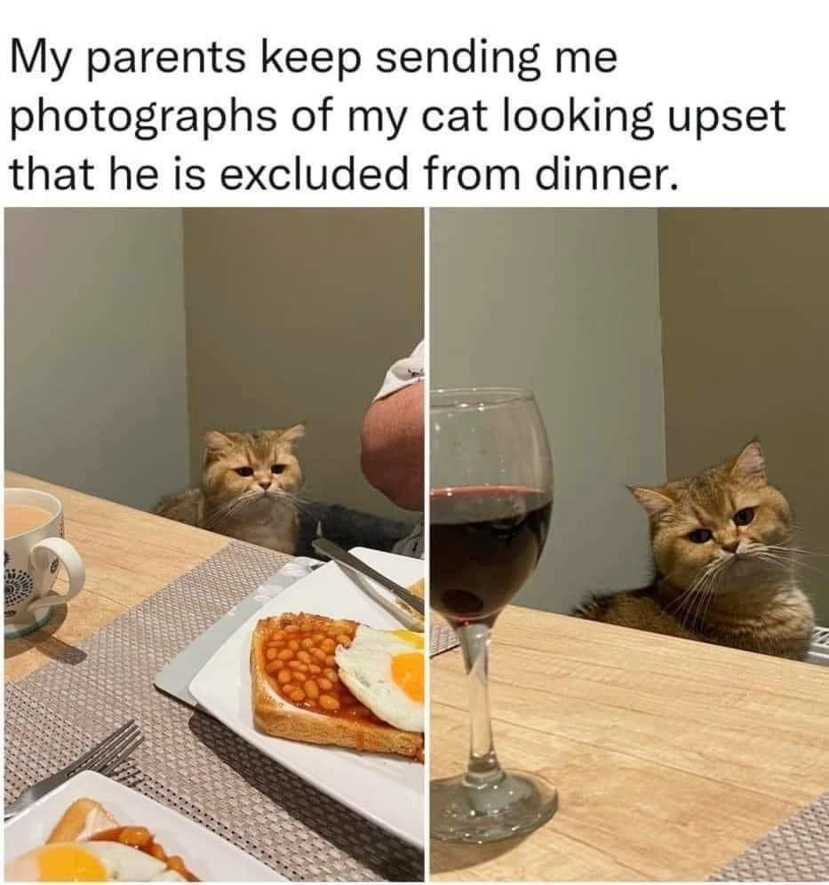 The cat is disappointed that you are eating eggs and beans for dinner... with a glass of WINE again