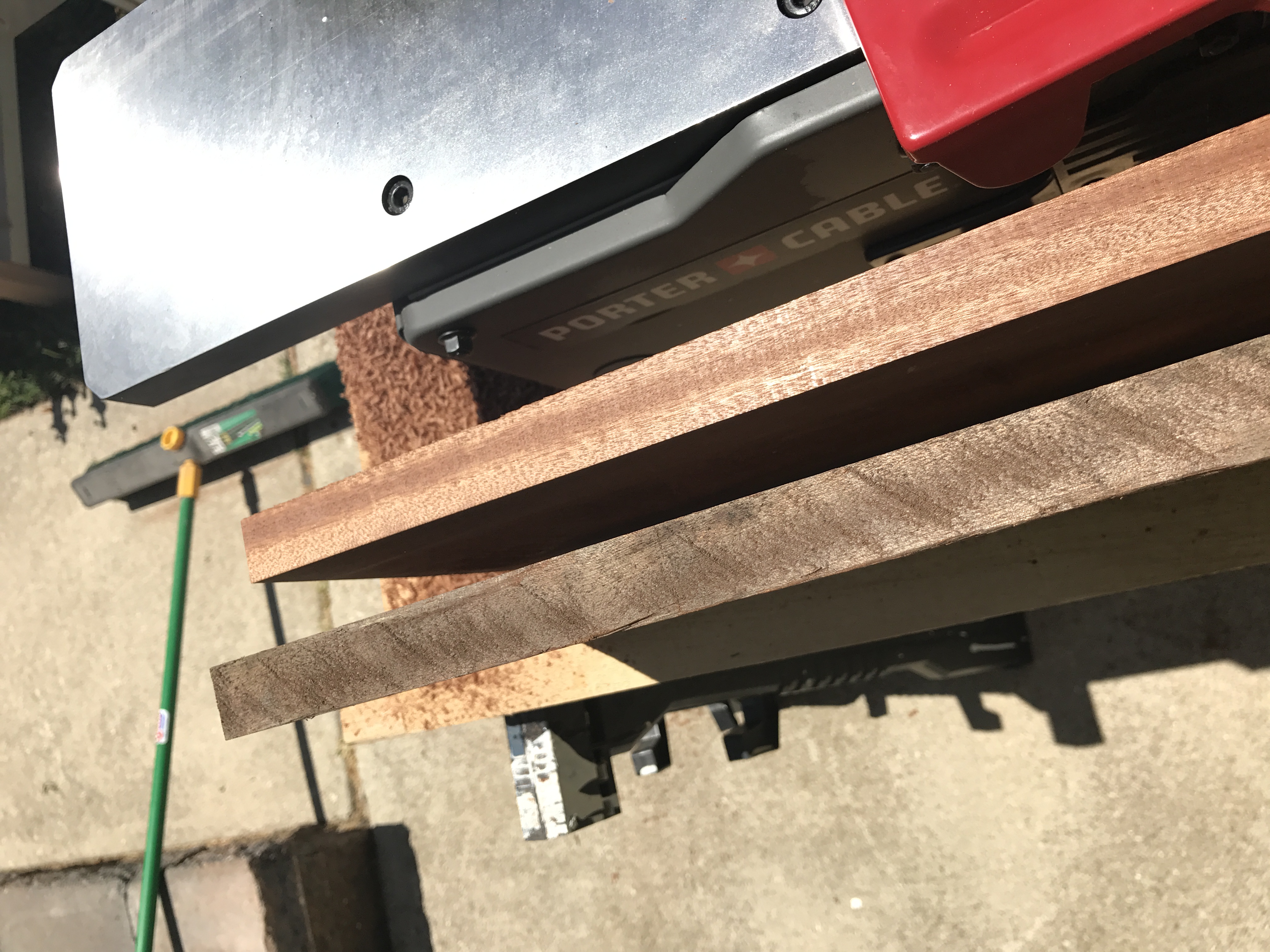 Starting the cuts. I got the tops from a local lumber mill that is going out of business. It's a mix of different lengths, widths and thickness. The wood is Sapele (I am still working to confirm this) and the base is made of 2x4's from old projects/a trashed bed.