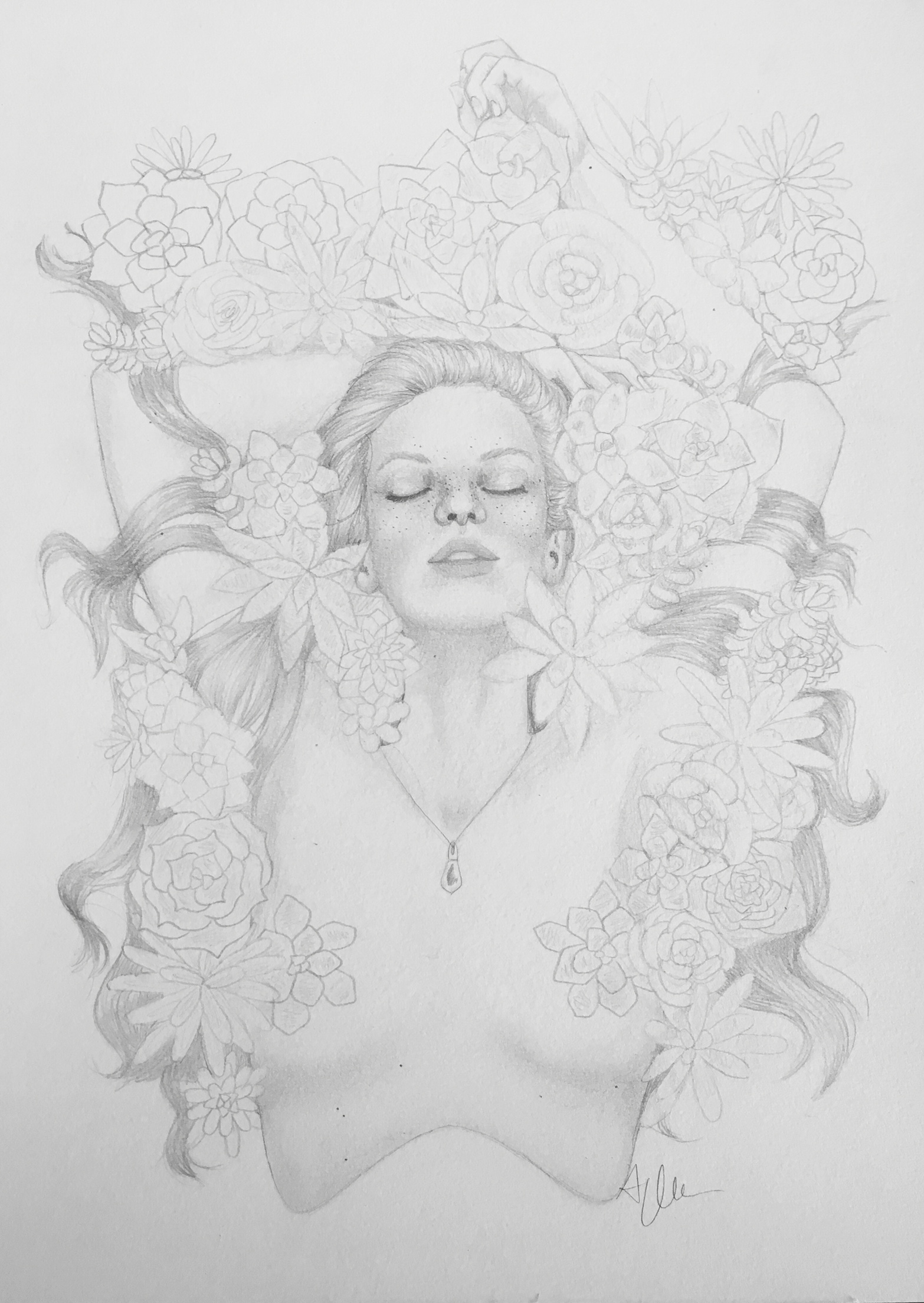 Here is the initial sketch. I love drawing succulents and pretty girls... I use lots of references online for poses and flower shapes. I use a mechanical pencil with .3 lead.