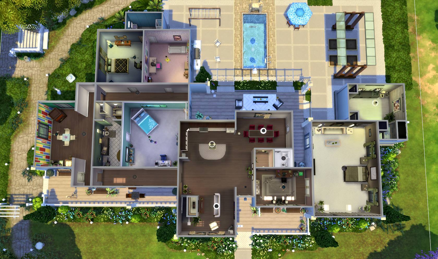 The lowest basement level has a small workout area, bathroom with shower and a collector's lab with displays of many rare and fun items for the Sim that likes to collect things.