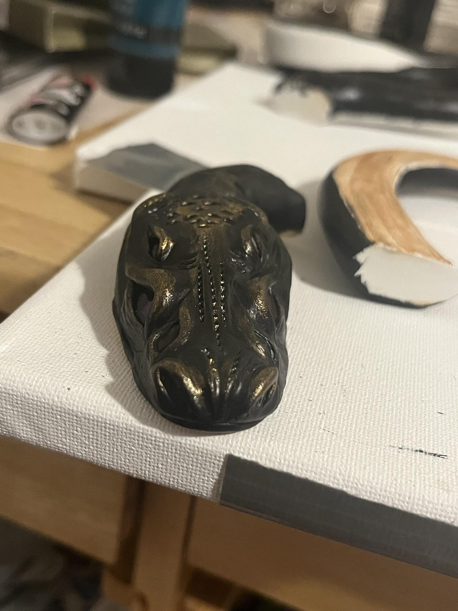 This is polymer clay with black painted base and bronze paint detail