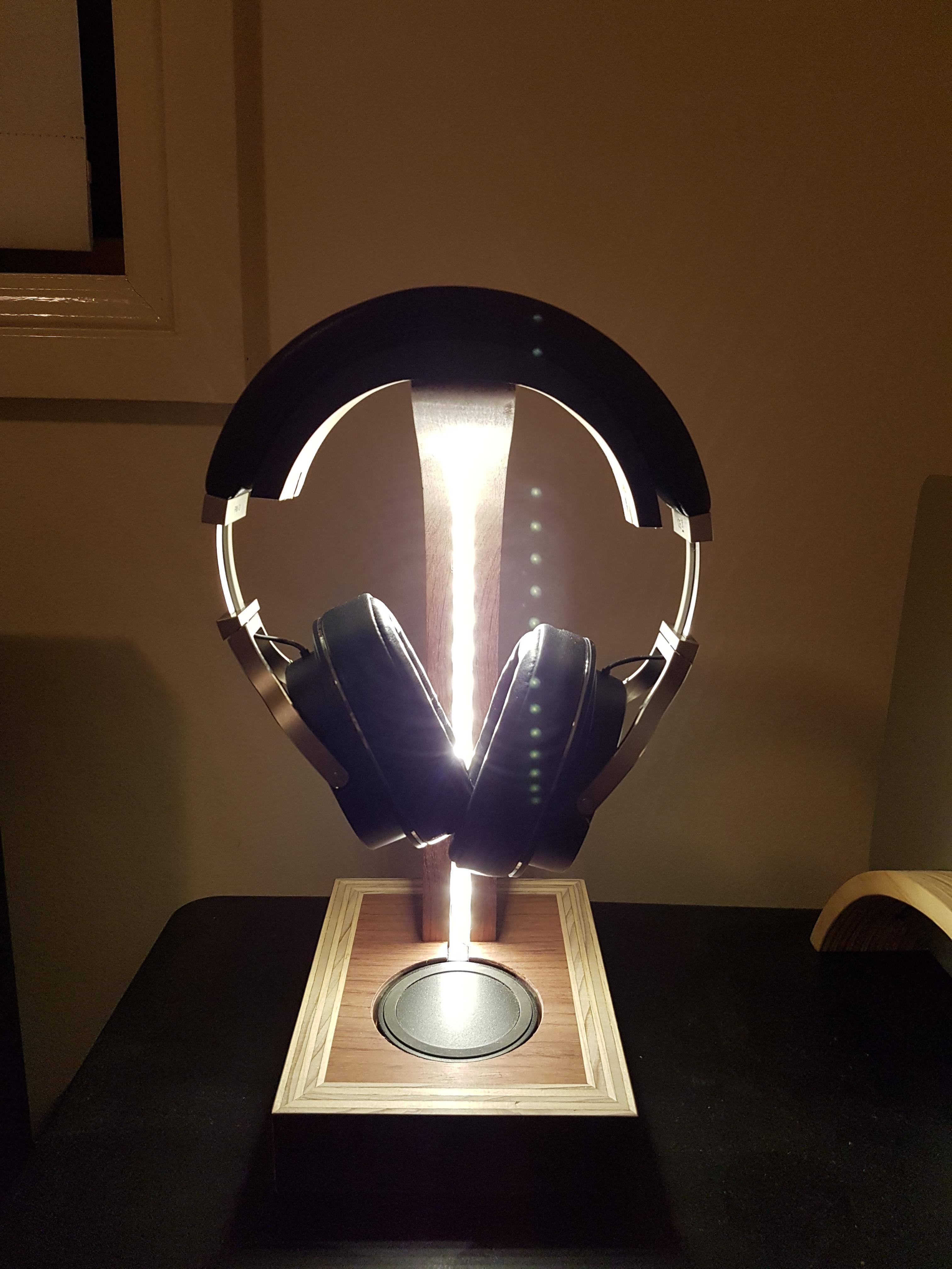 Finished! I dont have any photos of making the curve which the headphones rest on. I just traced the curve from my headphones onto the same formply as the base, made a copy, glued them together and then glued it onto the top of my arm, which was flat. It's hard to see in this photo, but the headphone curve has a flat section where it connects to the arm, you can see it better in the first photo!