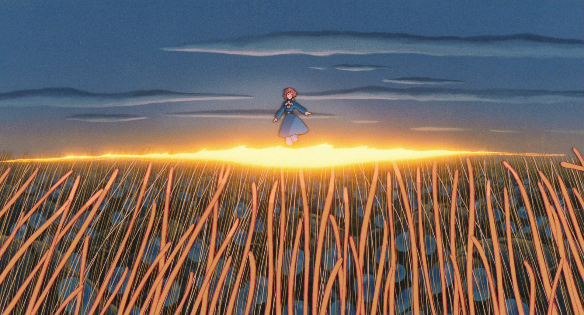 Away from the jungle exists a peaceful farming kingdom known as the "Valley of the Wind," whose placement by the sea frees it from the spread of the jungle's deadly toxins. The Valley's charismatic young princess, Nausicaä, finds her tranquil kingdom disturbed when an airship from the kingdom of Tolmekia crashes violently in the Valley. After Nausicaä and the citizens of the Valley find a sinister pulsating object in the wreckage, the Valley is suddenly invaded by the Tolmekian military, who intend to revive a dangerous weapon from the Seven Days of Fire. Now Nausicaä must fight to stop the Tolmekians from plunging the Earth into a cataclysm which humanity could never survive, while also protecting the Valley from the encroaching forces of the toxic jungle.