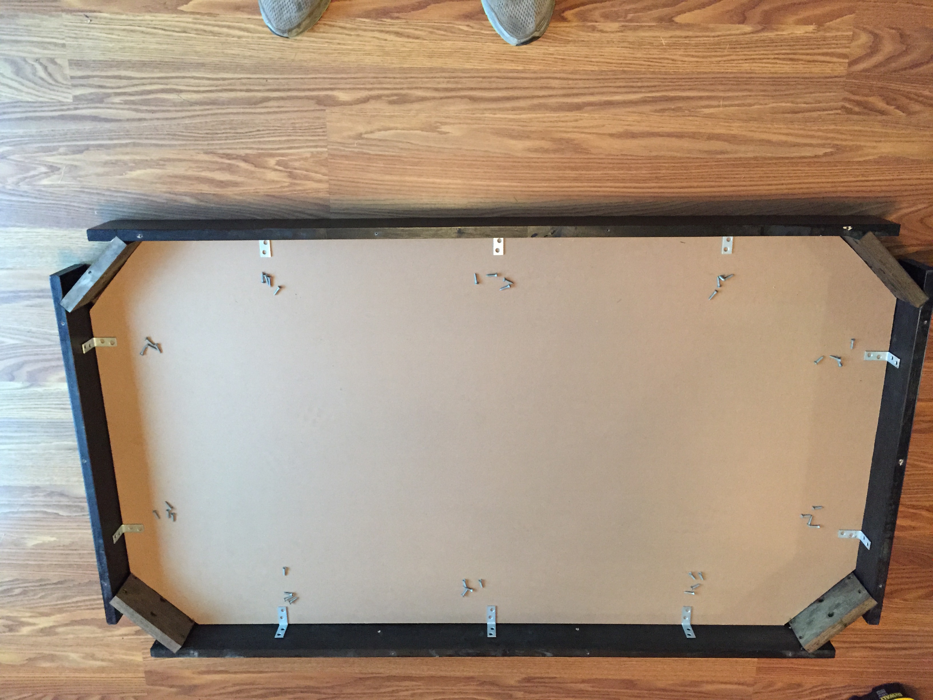 Here it is back upright with the legs attached, you can see the access holes that were used to be able to tighten the legs. I plan on installing felt so I wasn't too worried about the unsightly angle brackets.