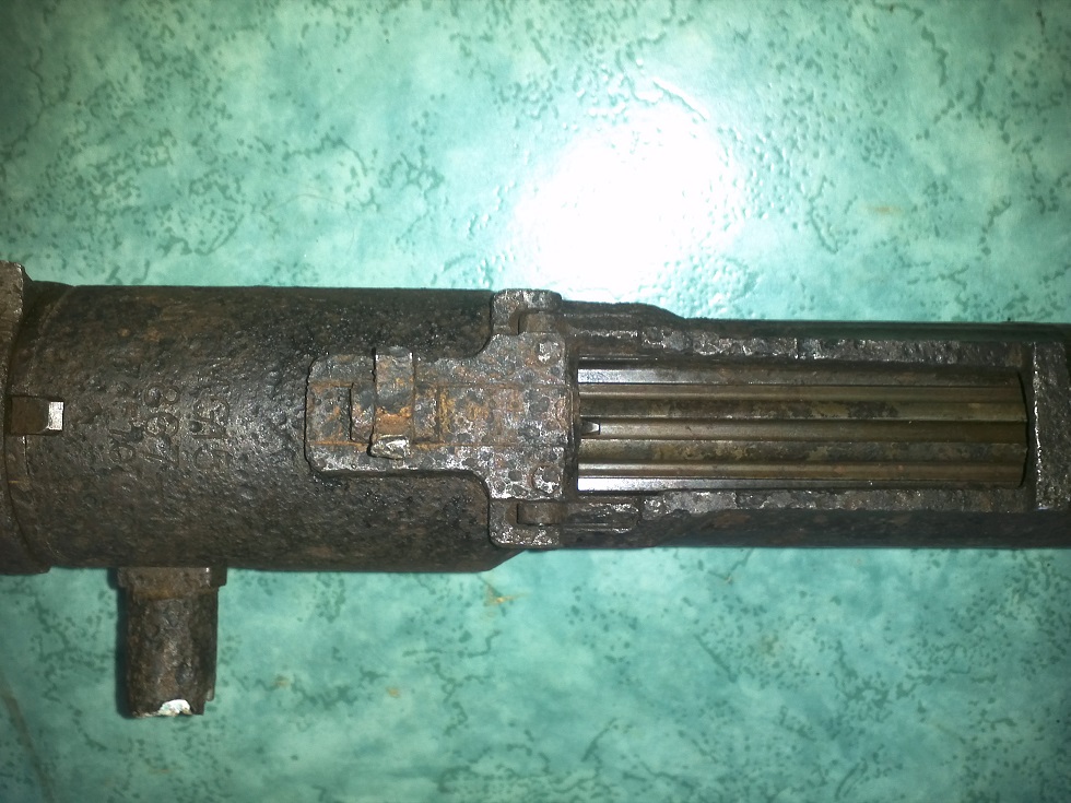 The result was amazing. With the electrolysis reaction turning some of the rust into carbon filling most of the gaps and giving the weapon and black look. I used WD40 again and burned it into the metal with a heating torch. I can still use everything on this one only since it's missing a big part of the handle of the bolt so cocking it is very hard do.