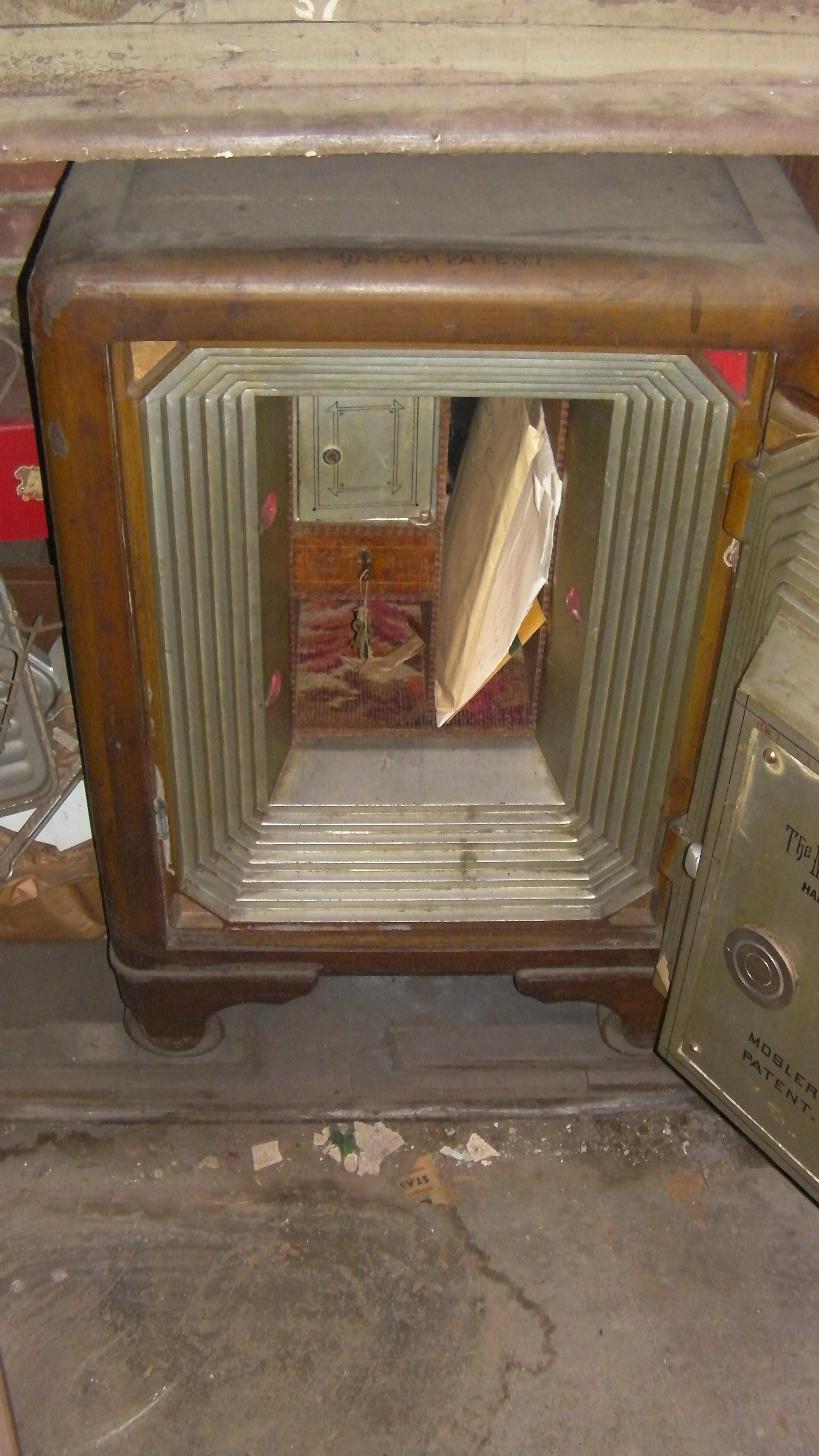 Inside the cabinet is a safe. A Mosler safe. The same Mosler Safe Company that made the safes that were installed in the Mitsui Bank of Hiroshima that were made famous by surviving the atomic blast.