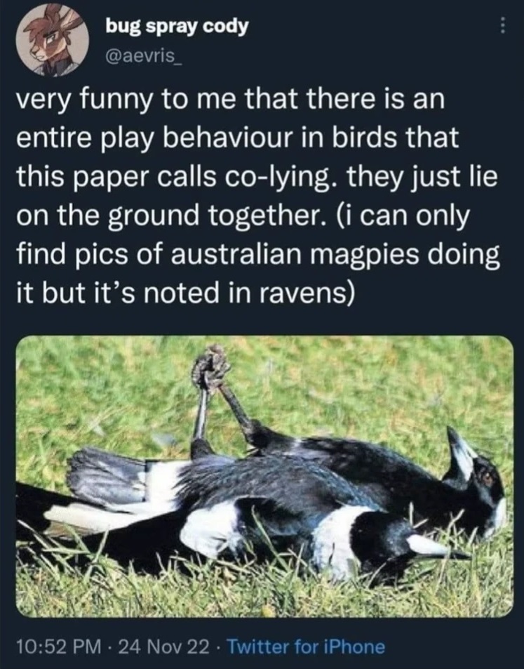 #4 I never saw Aussie magpies doing this, but I have heard their song. One time I heard this bird song that was the most beautiful bird song I had ever heard. Never forget it, and really annoyed I wasn't quick enough to think to get my cell out to record it. I couldn't believe it was from such a smallish bird, 2/3 size of a raven, if that.