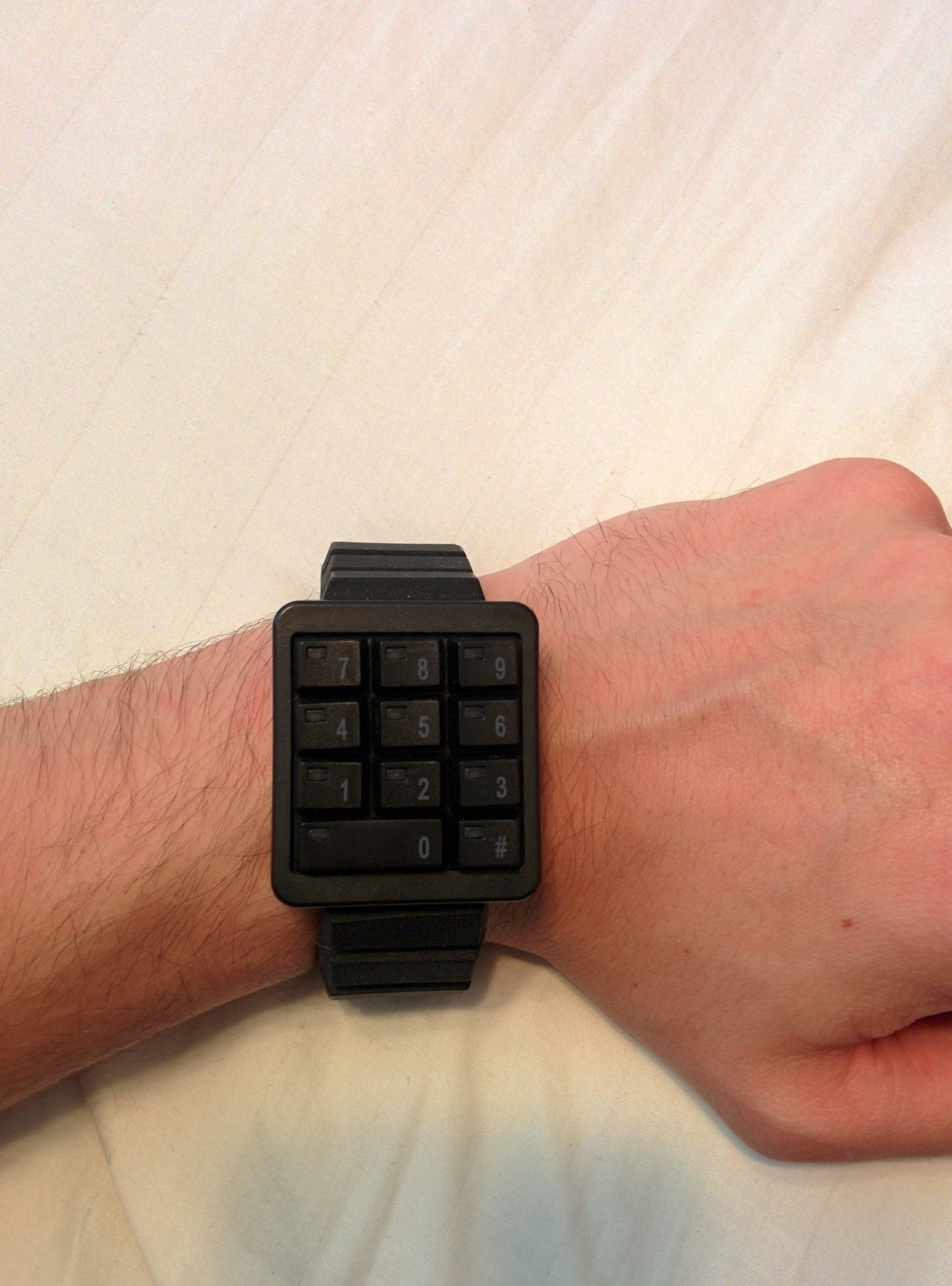 This watch is a big red button from an arcade cabinet that lights up the time when you press it