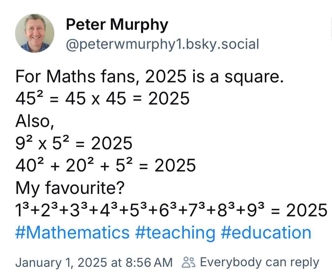 #28 also, 45 is 1+2+3+4+5+6+7+8+9, so (1+2+3+4+5+6+7+8+9) squared is also 2025