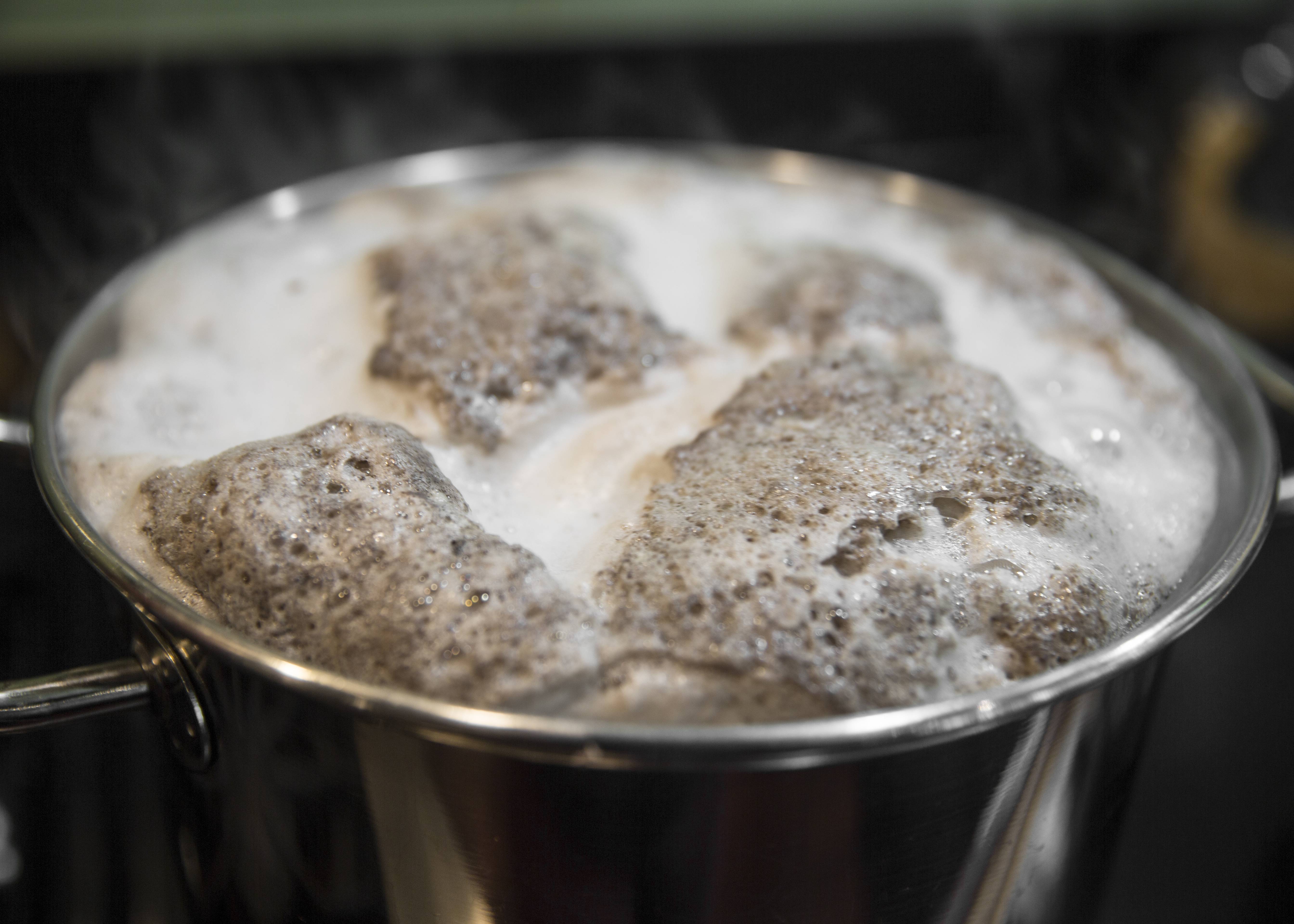 The feeties and spines need to be cleaned, so they're submerged in cold water and brought to a boil. This is foot scum foam. I never said this would be a glamorous process.