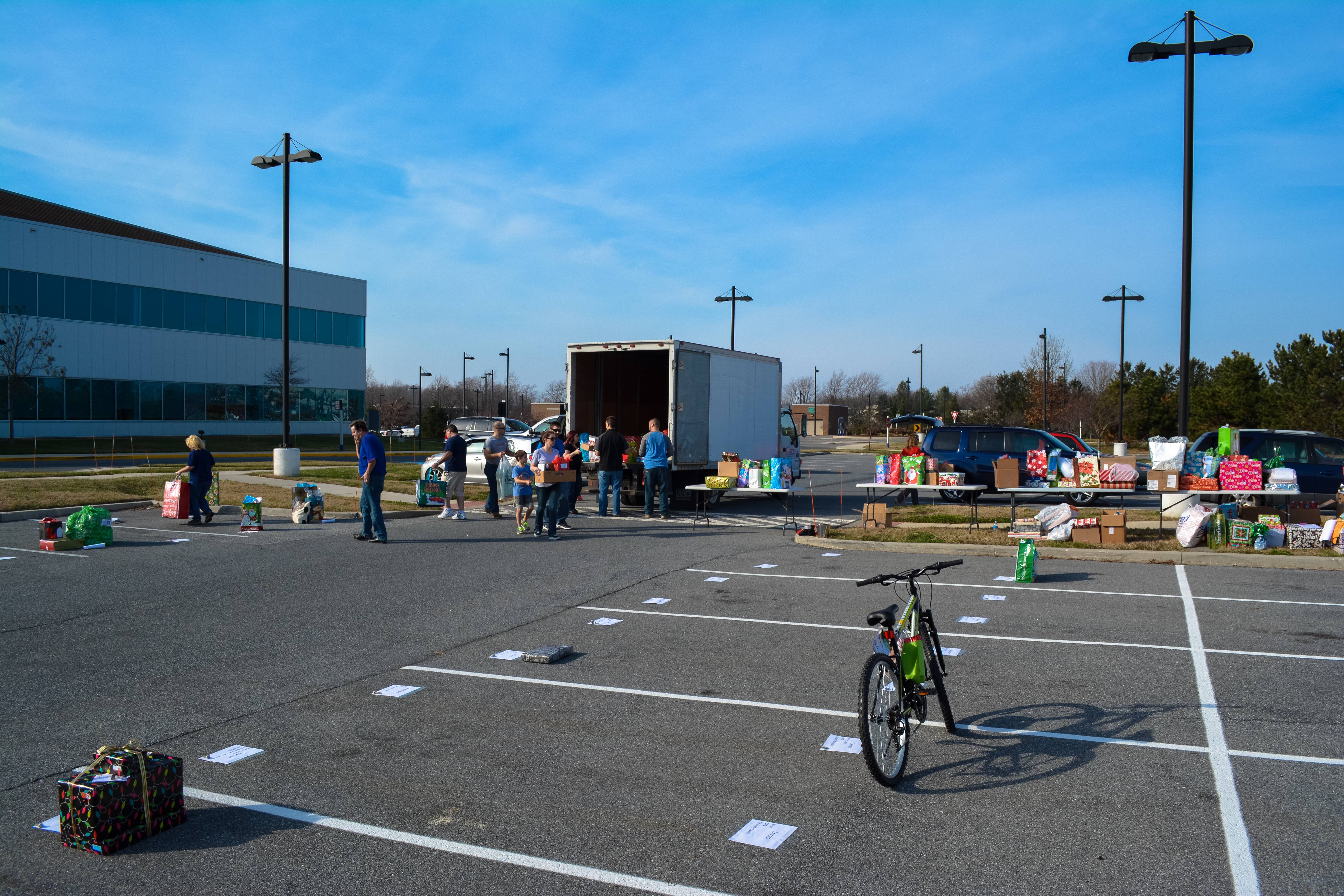 We had about 20 people show up to help, many of whom spent all day walking back and forth in a large parking lot, distributing presents.