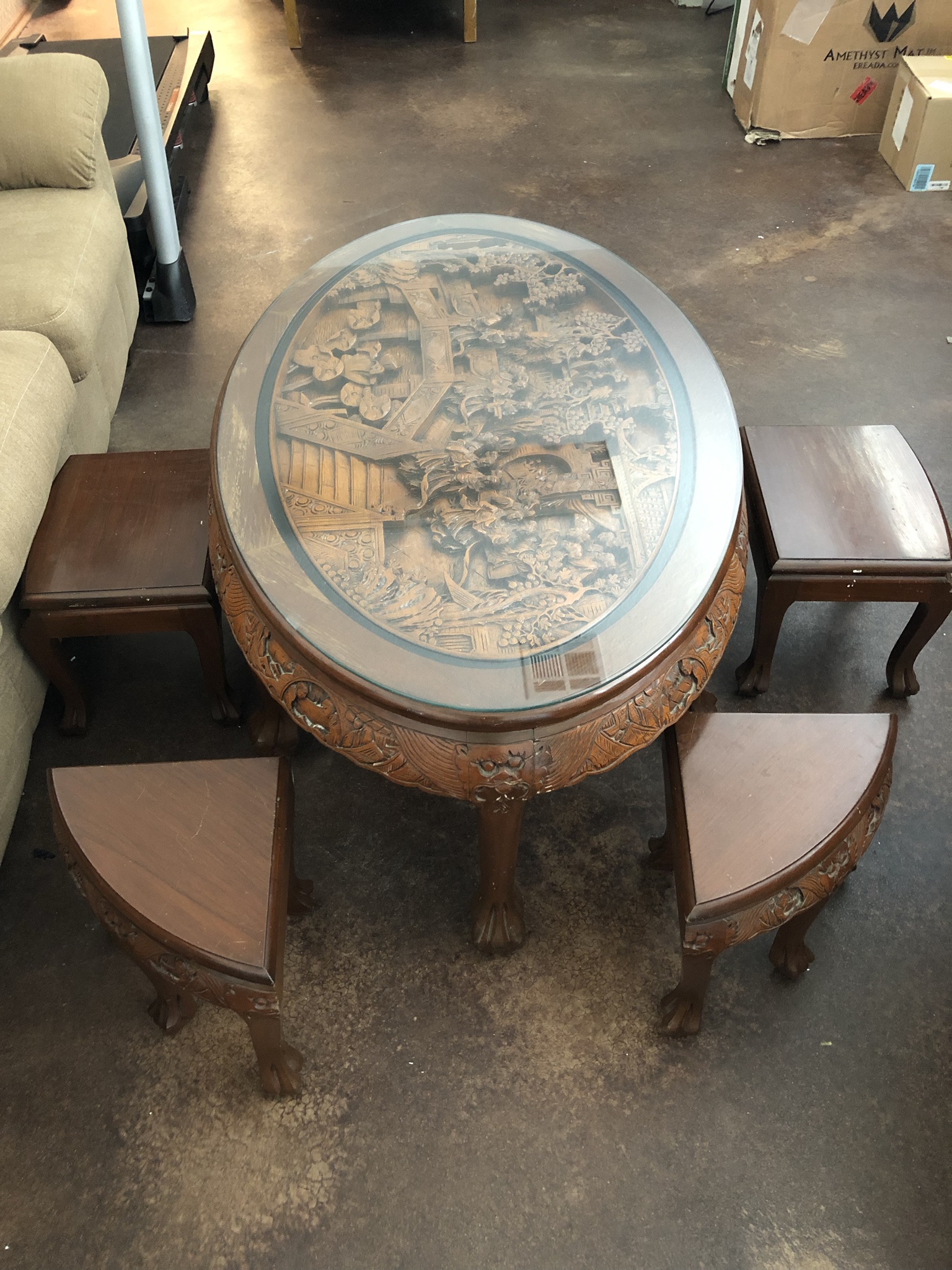 My mom used to have this EXACT table but it was black and painted with gold accents while the relief under the glass was super colorful