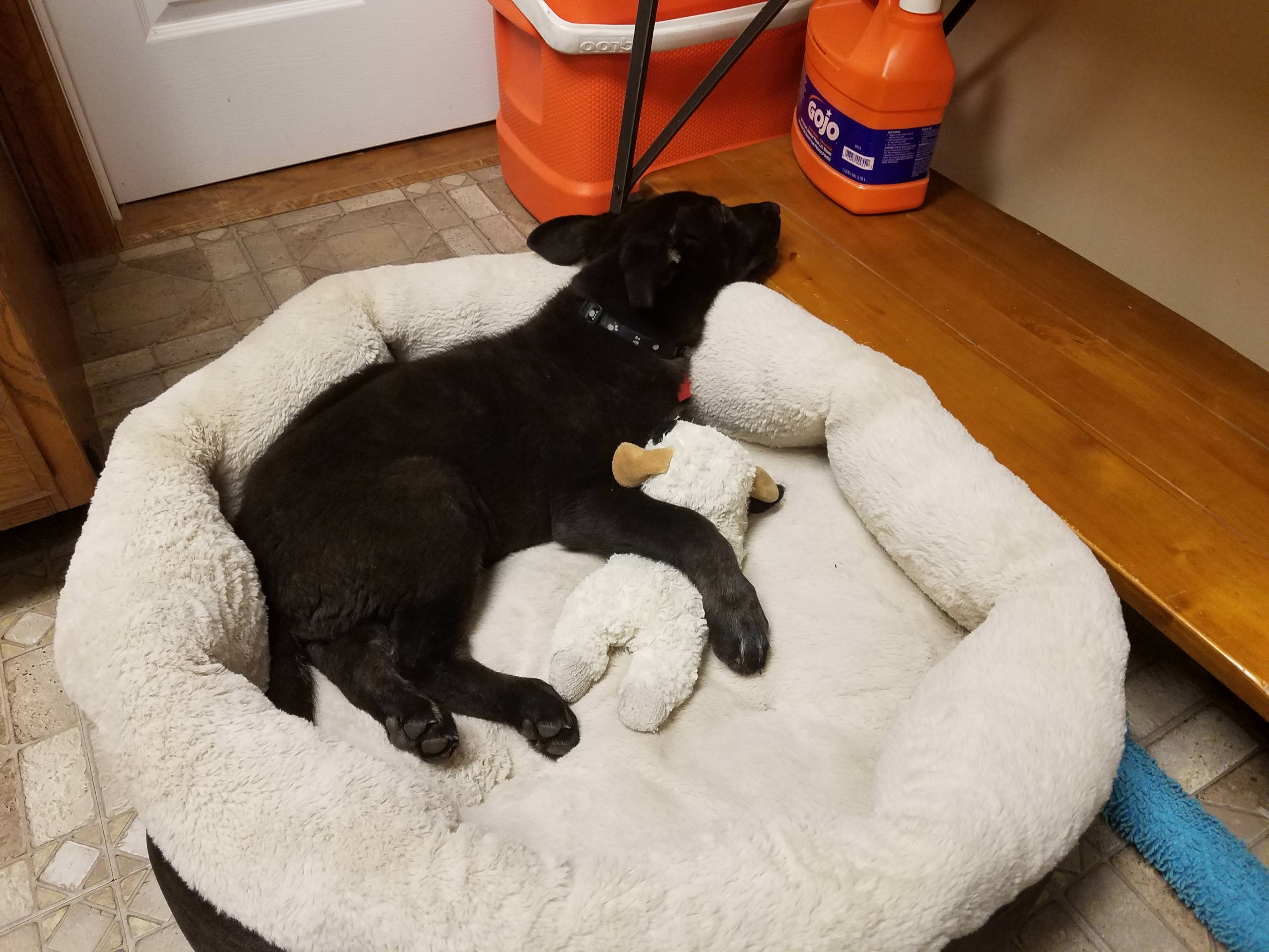13 weeks, 23lb. Doesn't like to sleep anywhere but the kitchen next to the food bucket. Moved his dog bed in there so he wasn't sleeping on the cold floor.