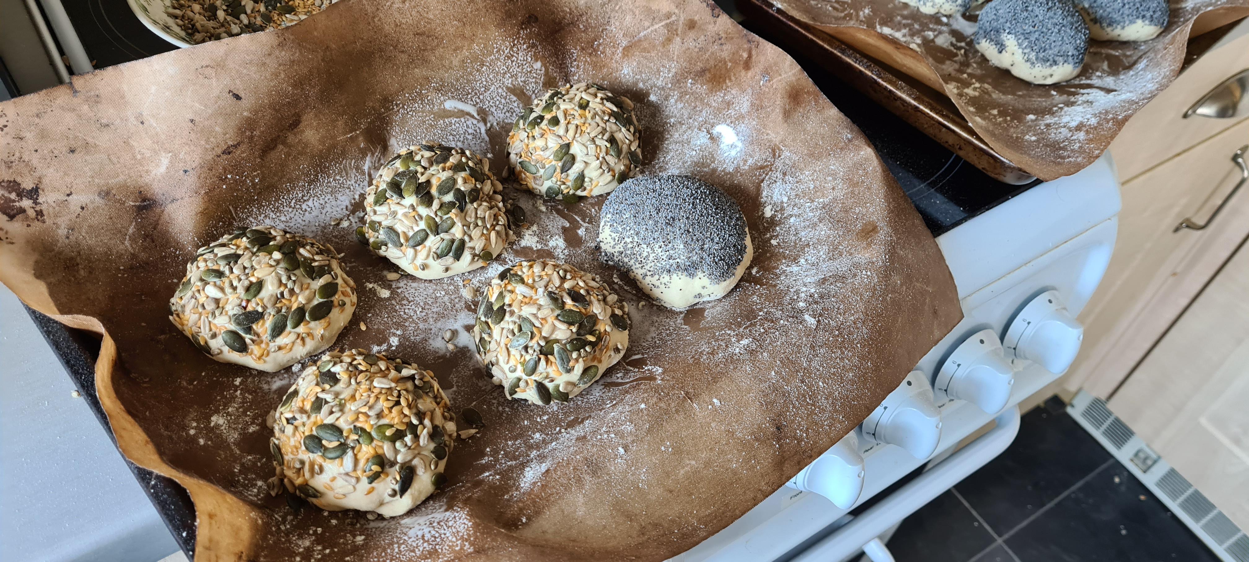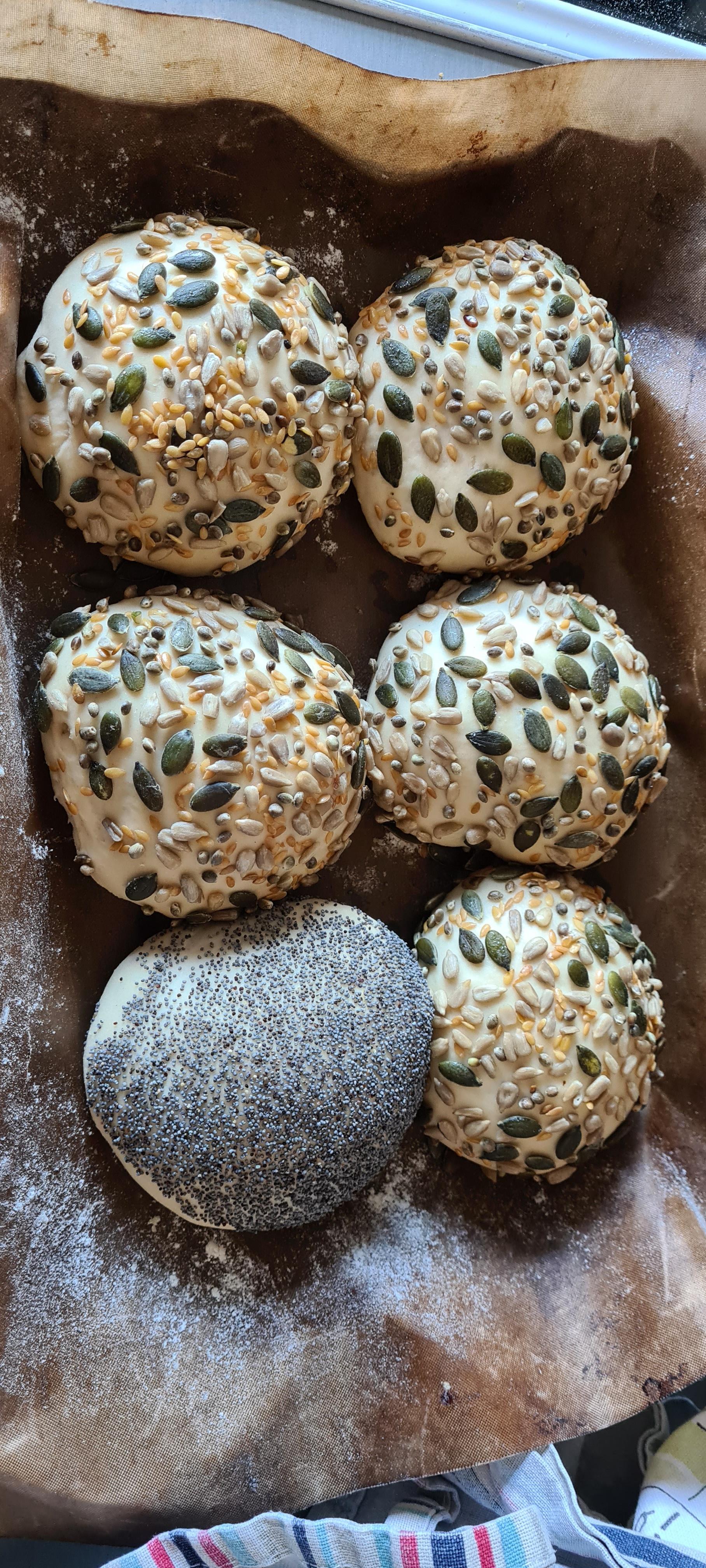 After its first proof, chopped and formed into 10 balls, washed and dipped in seeds