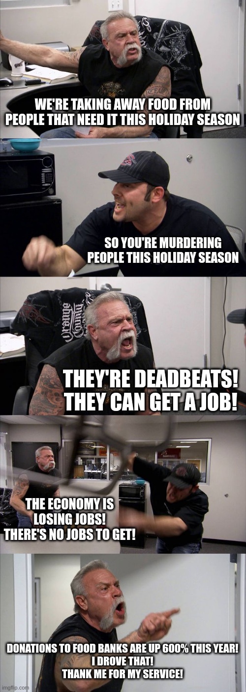 Wife and I are fortunate to not be too badly impacted in all this. We have a vacation fund we grow each year, but decided a food bank would make much better use of it instead of us being douchebags going on vacation while people are starving. Sick of a nepo baby holding peoples' lives hostage as a way to throw a tantrum until he gets what he wants. We need criminal liability for politicians getting people hurt and killed.
