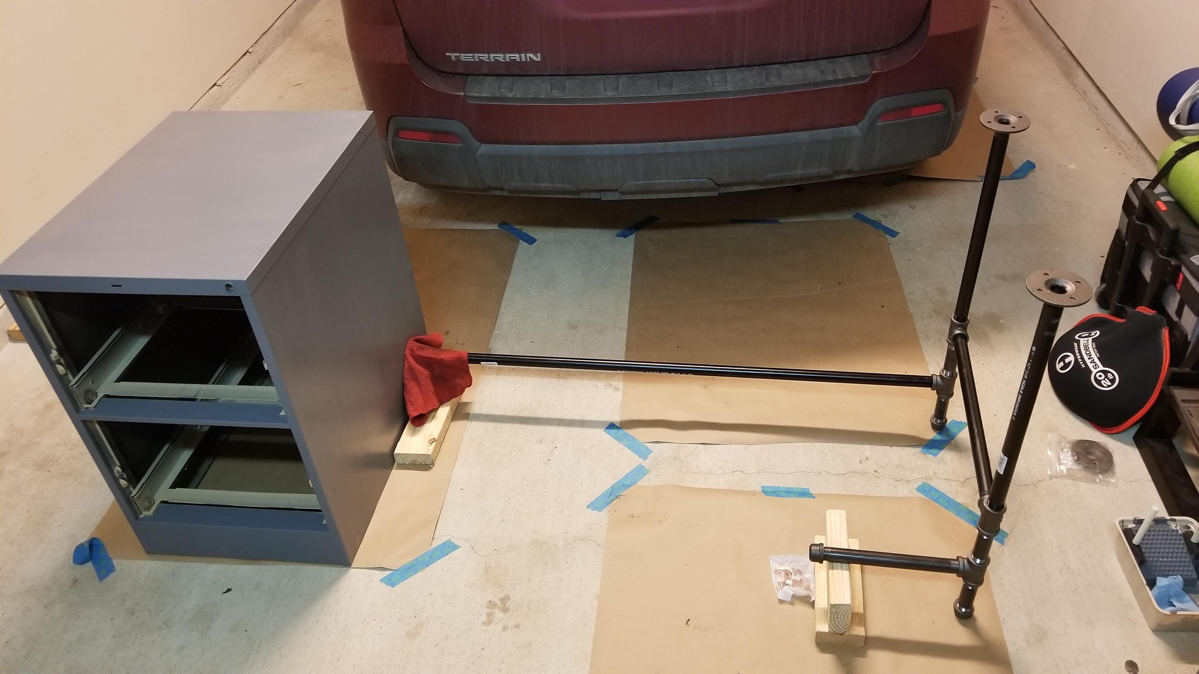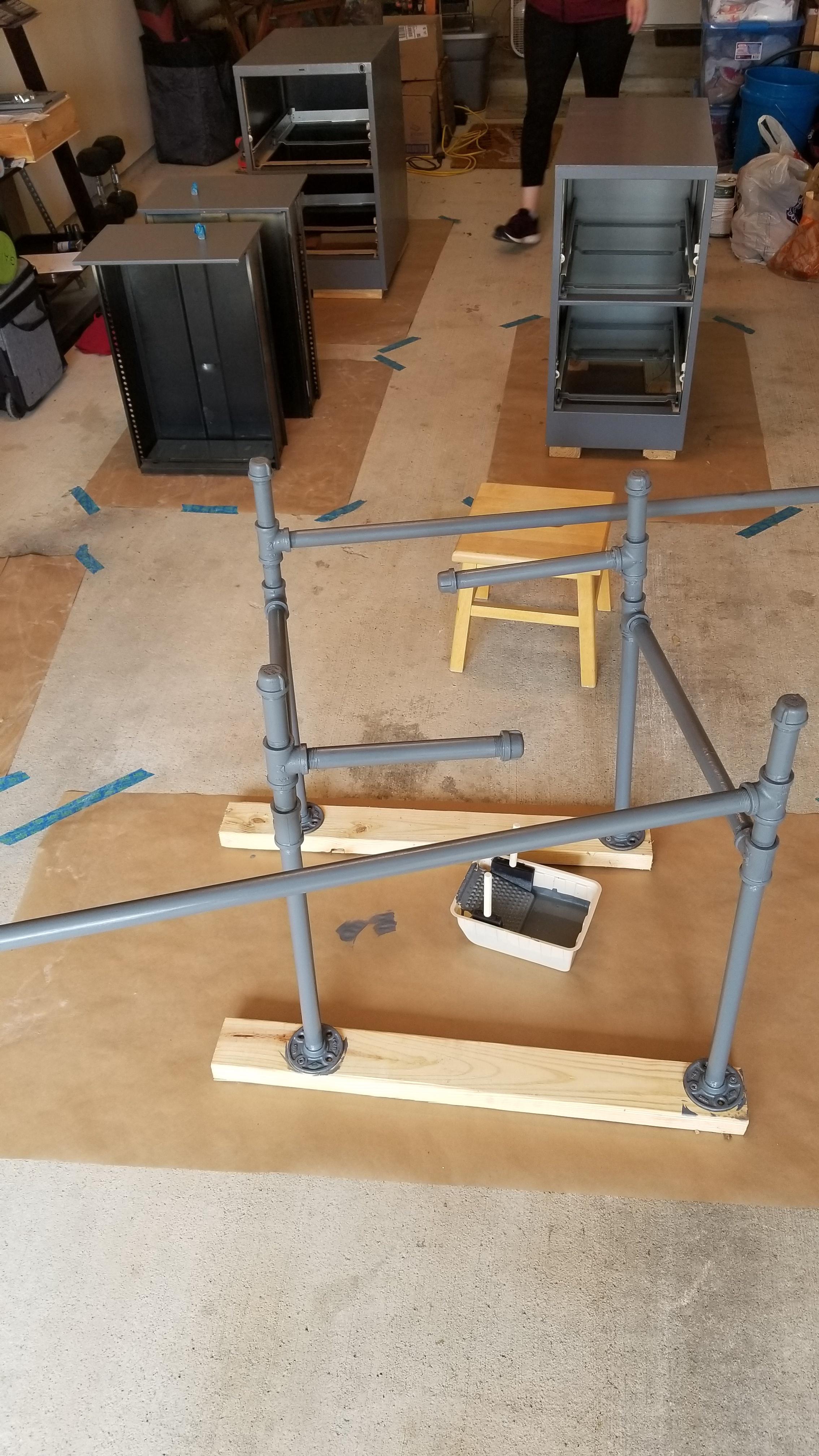 Requirement was to match since both will be in 1 room and to have storage. We liked the wood and pipe style but couldn't find a way to add drawers that looked like they would last. I use to work office supplies and wanted commercial style filing cabinets (not the flimsy type from office supply stores for home use). I liked the HON cabinets but wasn't super excited about drilling holes into a $250-500+/ea cabinet.