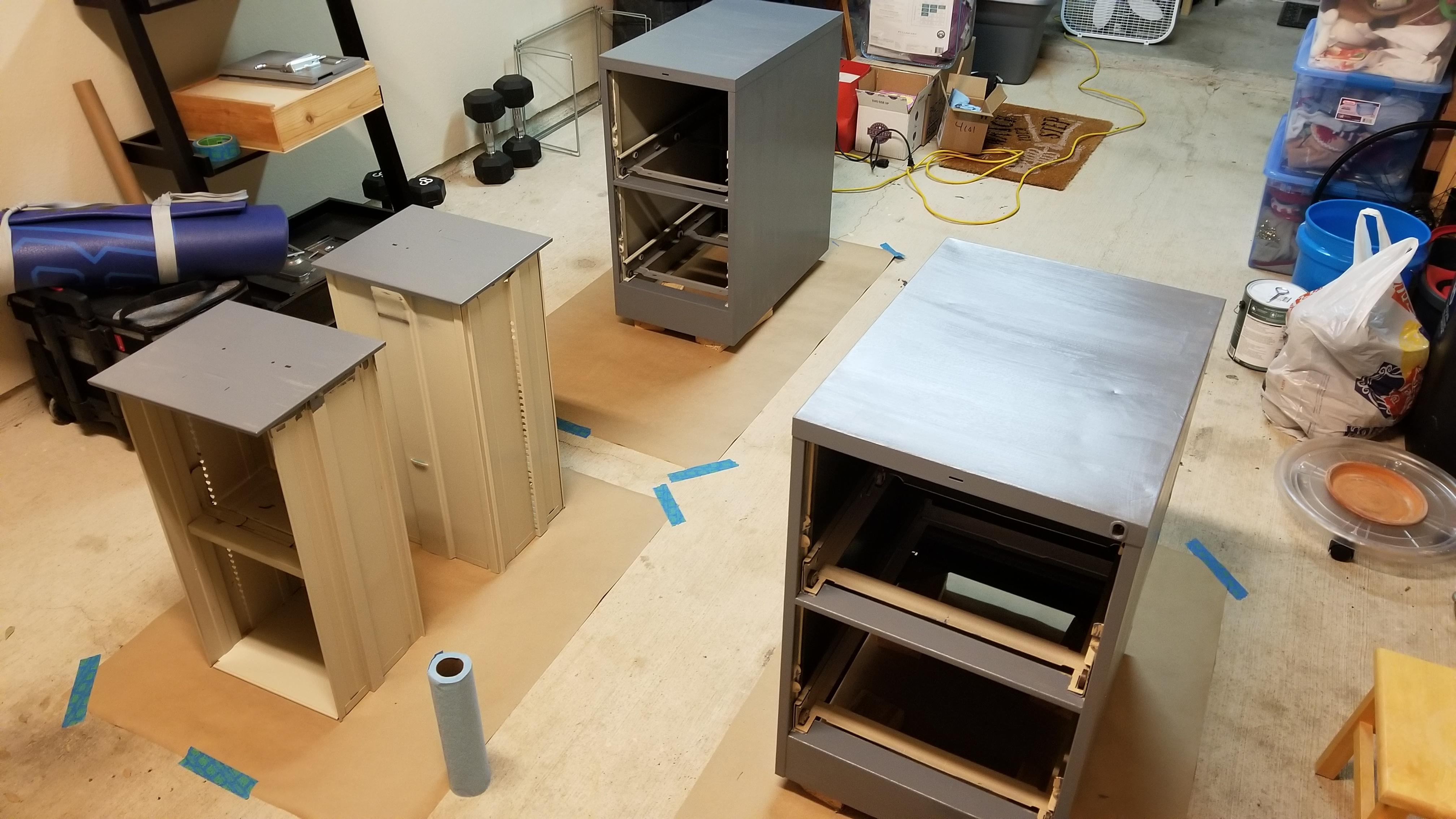 Pulled the drawers, handles, and trim off. Sanded down and painted 2-3 coats each. Paint is a Behr in a cool gray. Thought it would make a good contrast to the darker warmth of wood stain for the top. Make sure to ask the older lady at the paint counter for help to make sure you get one to use on metal without using a primer.