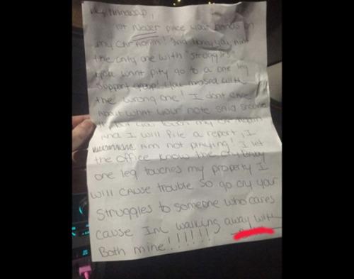 “Hey handicap! First, never place your hands on my car again! Second, honey you ain’t the only one with ‘struggles.’ You want pity go to a one leg support group! You messed with the wrong one! I don’t care what your note said shove it, but you touch my car again I will file a report, I am not playing! I let the office know the cry baby one leg touches my property I will cause trouble so go cry your struggles to someone who cares cause I’m walking away with both mine! -[expletive].”