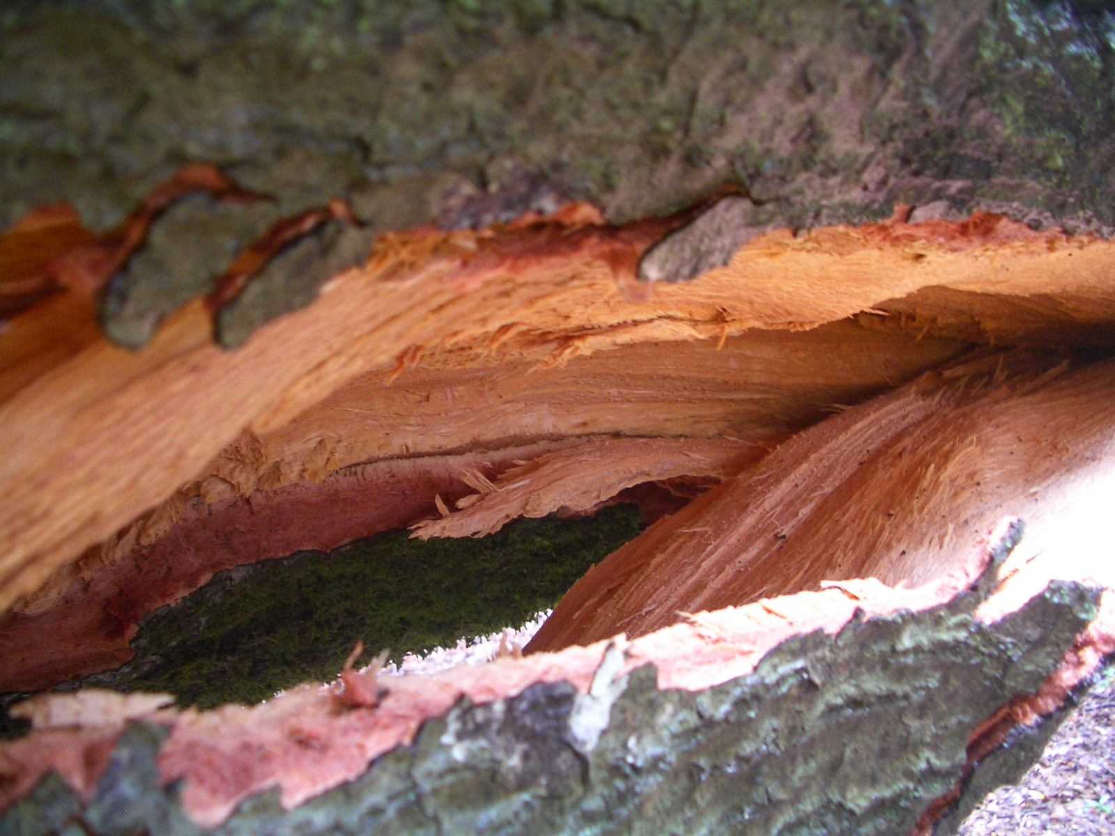 Wind took this big oak during a heavy storm. The force of gravity tore the heartwood of the trunk right in half when it fell.