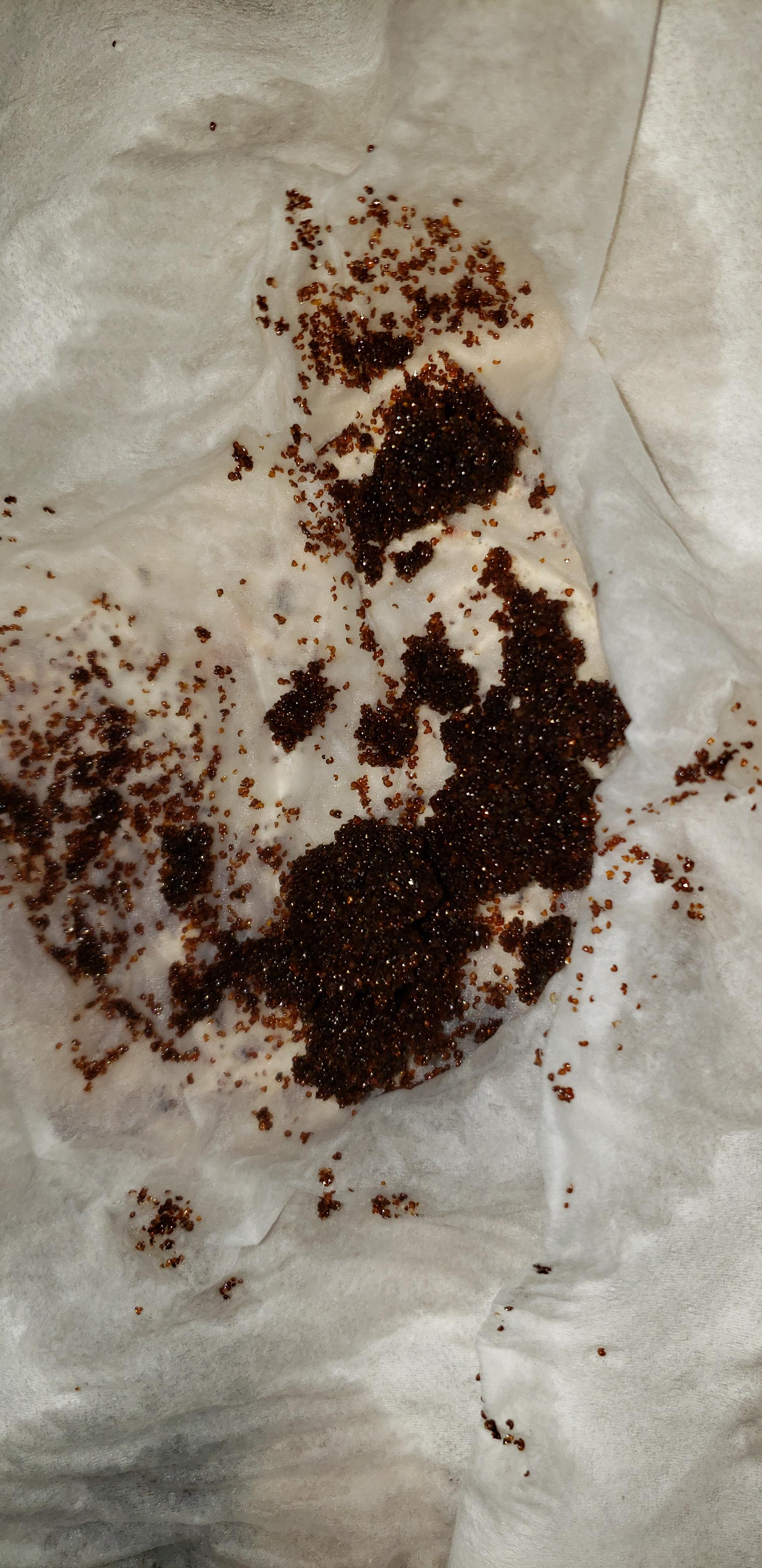 It feels like gritty dirt or sand, but it's sparkly and shiny like something synthetic. No smell or odor. don't think it's rust or coffee ground, too uniform.