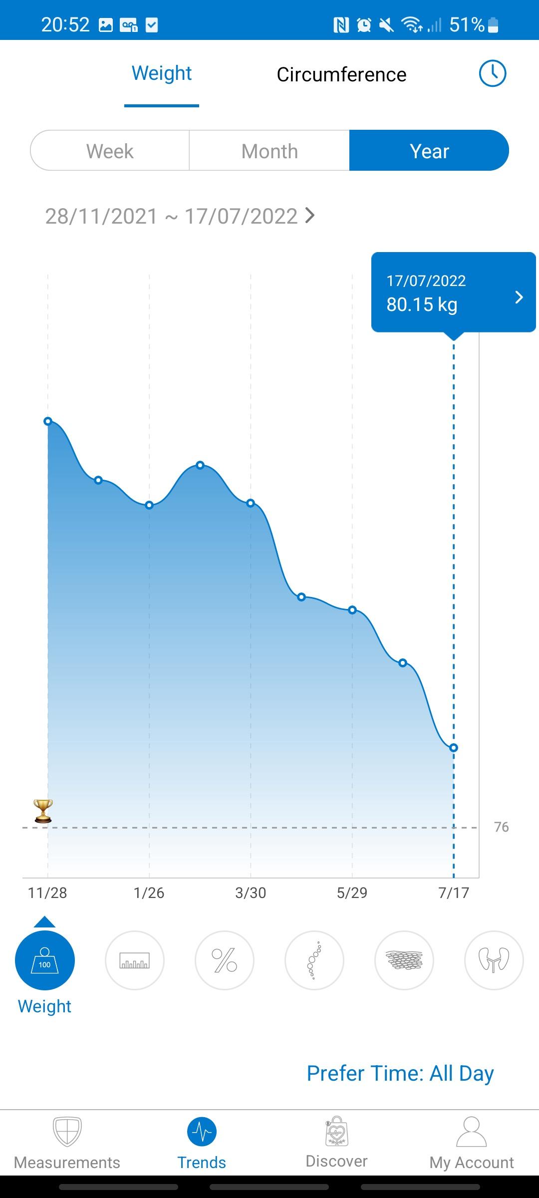 You can see a little blip in my progress here in January/February when I broke my pinky skateboarding (I'm 36 btw, do you, boo) and couldn't cook for myself properly. If you're trying to lose weight I cant recommend cooking for yourself enough. I bought a £15 ($20) scale with accompanying app to track my weight.