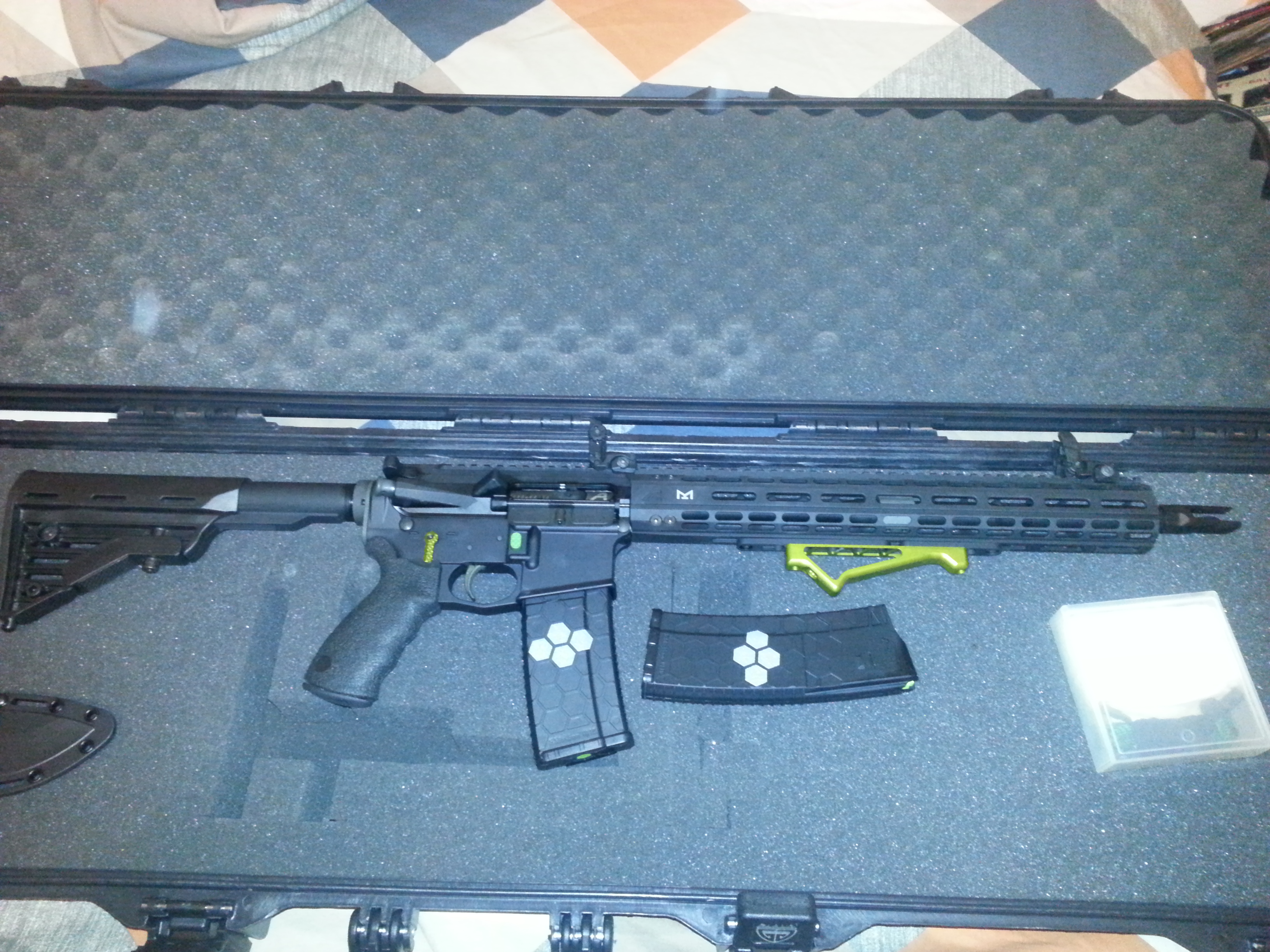 Aero precision upper(and inners), Daniel defense barrel, Adcor lower, Palmetto Arms lower completion kit, Seekins muzzle break/mag release/fire selector.