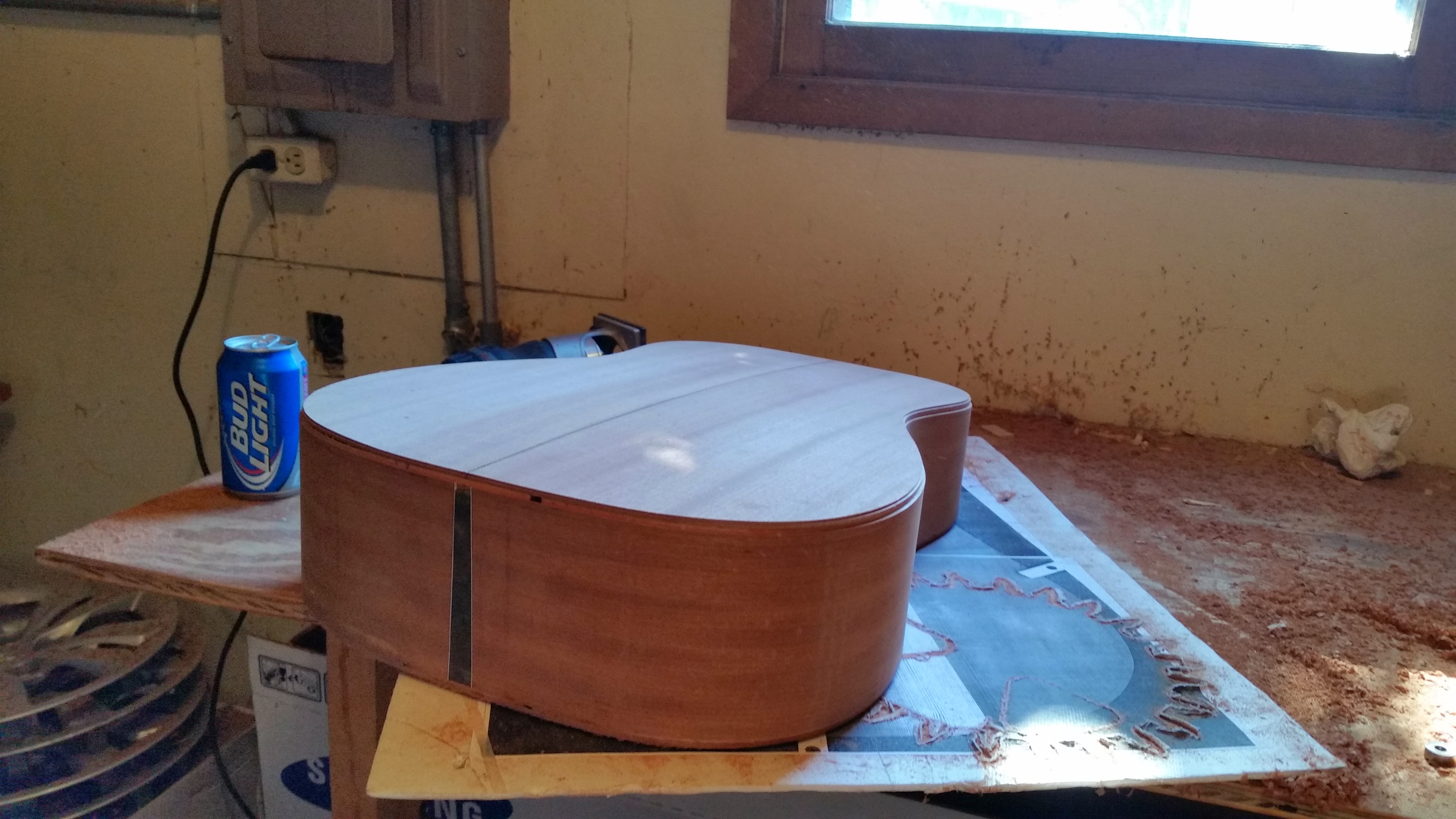 Adult beverages always help projects to a point, right? You can see that I've taken a router to the edges. This is so the binding and purfling (the decorative edge stuff) can get glued onto the body. It helps to hide seams and ugly stuff.