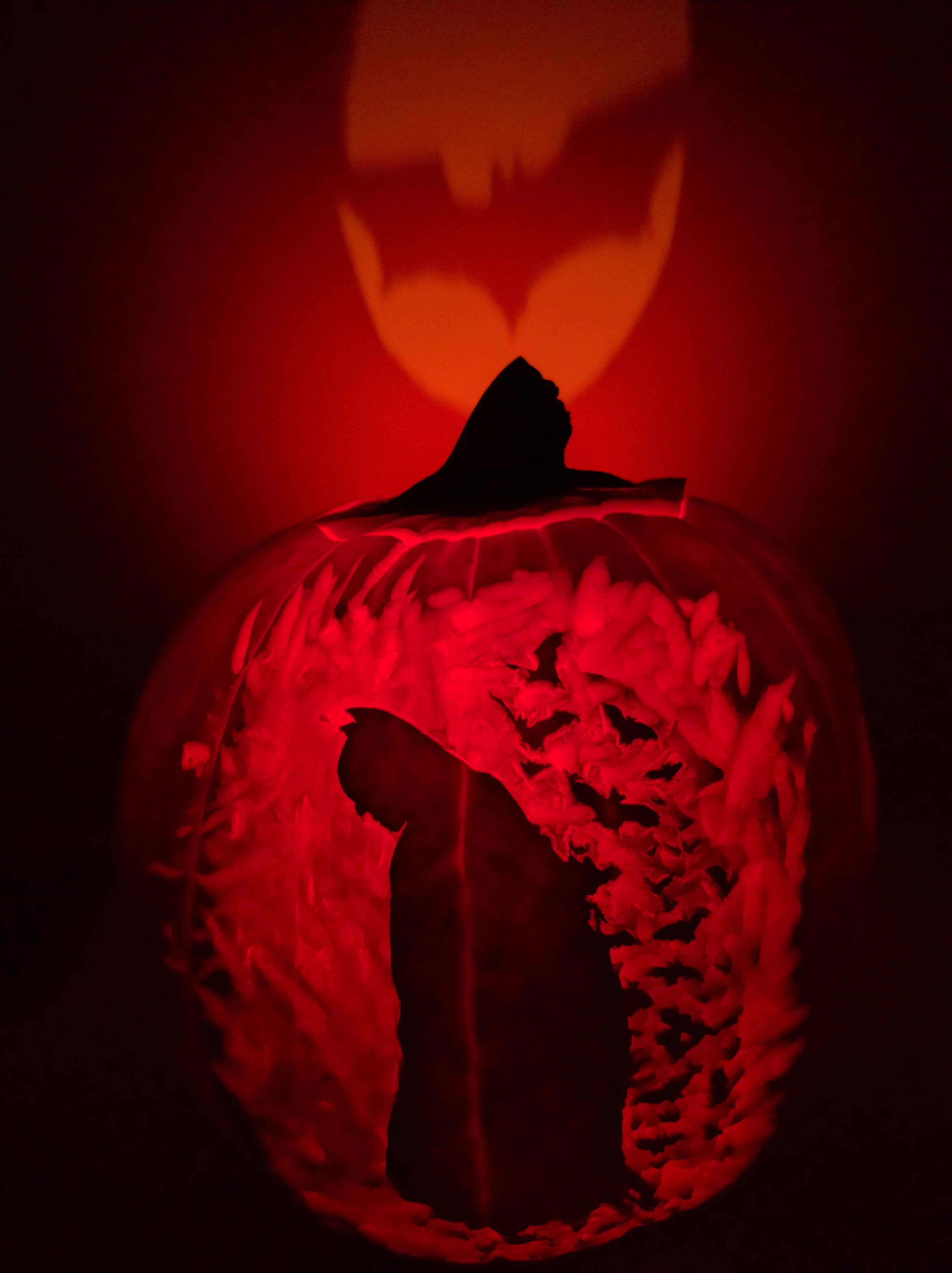 On the back of the pumpkin, I carved the bat-signal, so that the candle actually projects a bat signal on the wall.