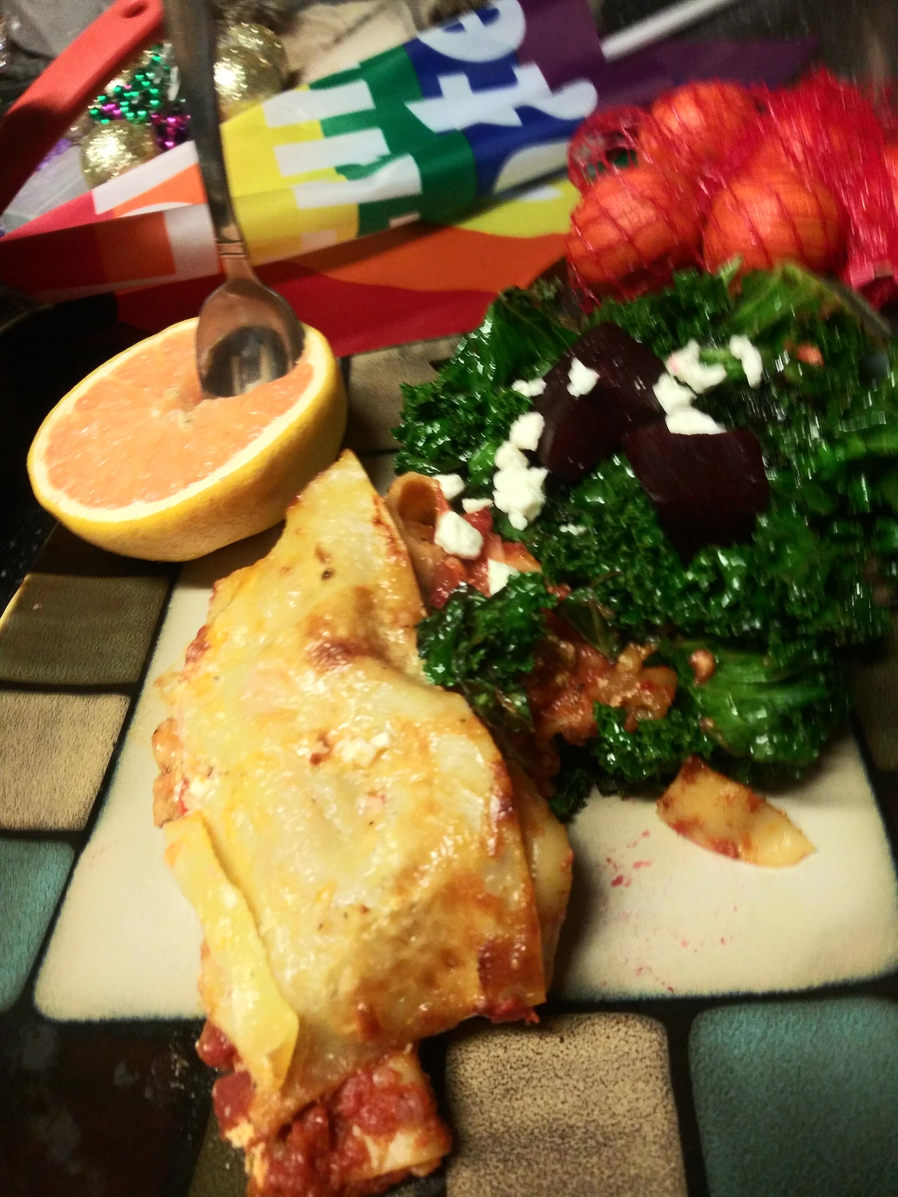 Homemade lasagna with kale and beet bacon grease salad