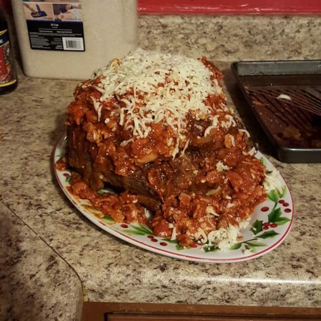 My friend and i made the meatball deathstar from epic meal time. 5lbs of seasoned groumd beef stuffed with cheese tortellinis, sauce and motz. Maple bacon meat sauce on top and it all rests on a loaf of baked garlic bread. I wish i could have shared it with the world.