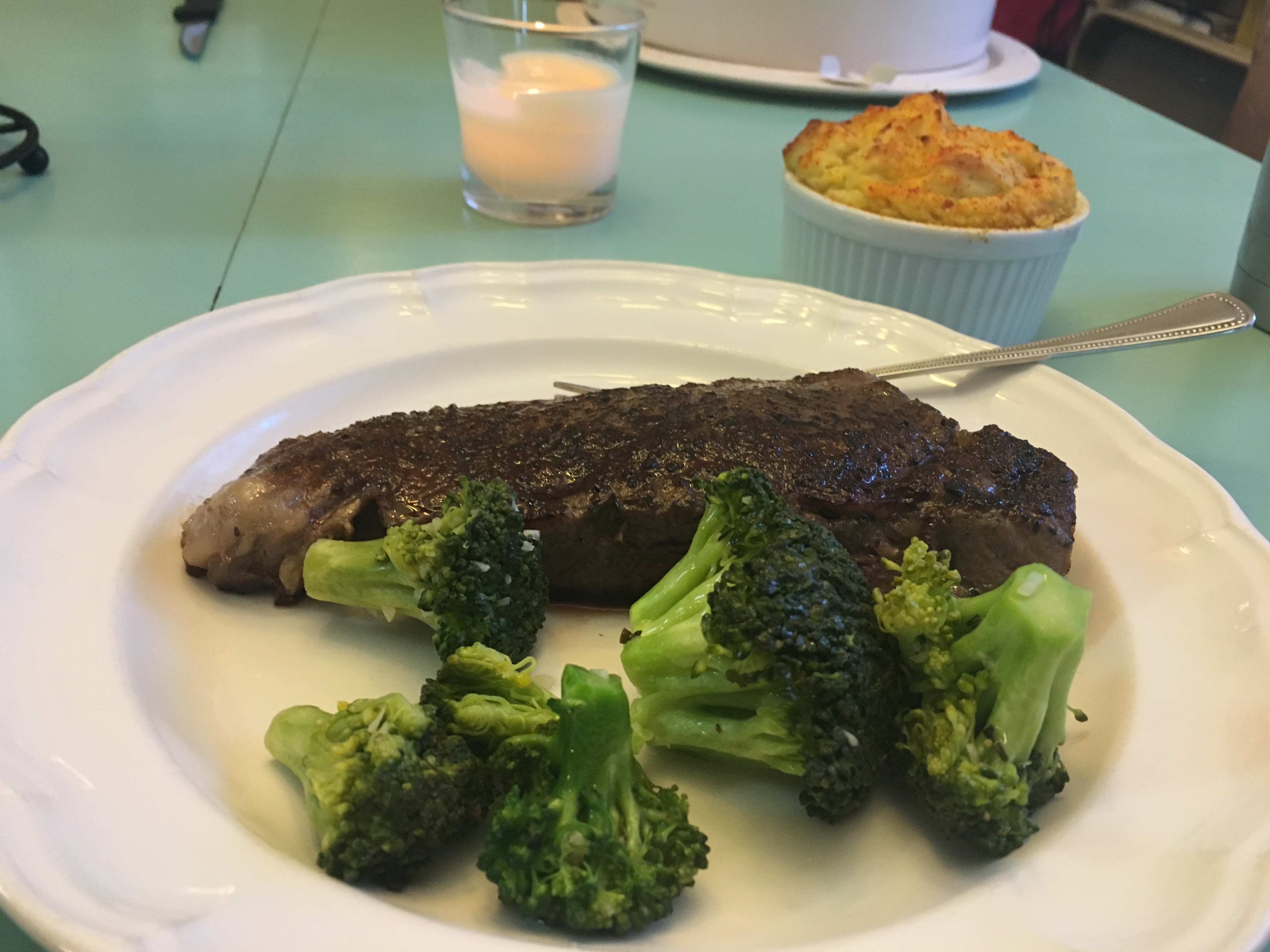 Sous vide Prime 1 New York strip steaks with sous vide broccoli and Potato Soufflé