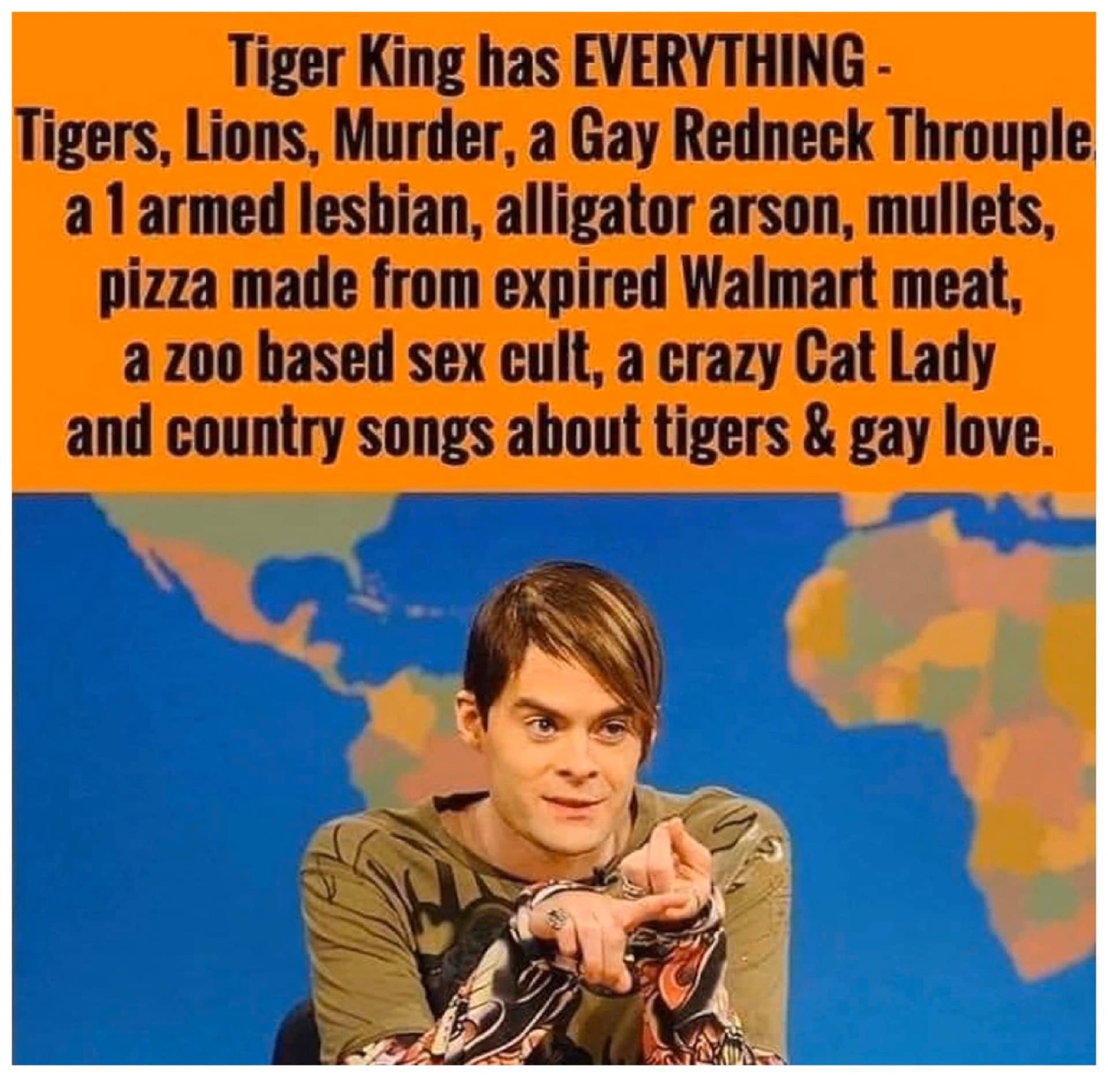 If you haven't seen the Tiger King documentary on Netflix, let me tell you this isn't even half the messed up stuff going on. I started watching it on Netflix after seeing memes like this. This is an excellent 8 part documentary about the biggest non-political dumpster fire I've ever seen. Just be patient with the first 2 episodes. There is a lot of footage of Joe Exotic, so it takes a couple episodes before the real twists start coming up.