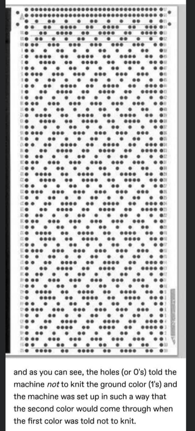 I'm faiiiirly sure binary was made by a bunch of renaissance math guys, not the textile industry. Jacquard loom, however, is the coolest shit ever.