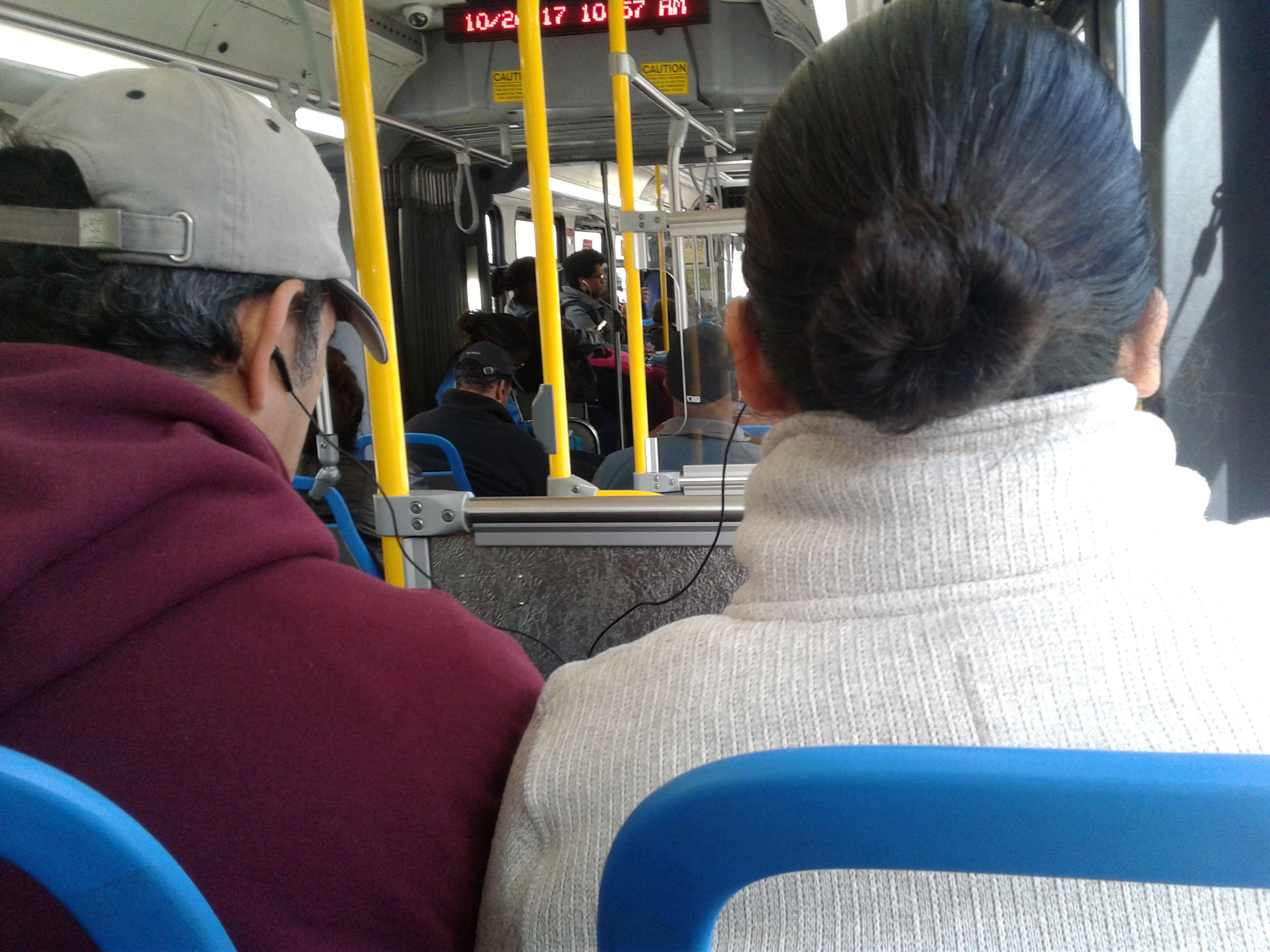 this older couple sharing headphones on the bus