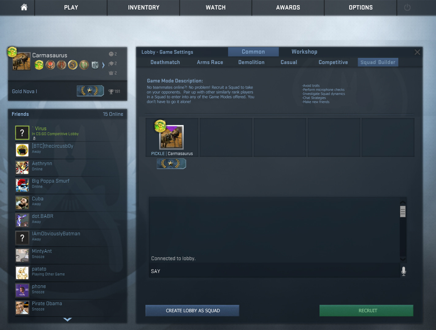 WTF is up with the blind dating solo queue in Counter Strike: Global Offensive. How are you expected to rank up with the massive amount of trolls, smurfs, mic-less and just plan assholes in this game? My answer, Squad Builder. A place you can meet random players of similar rank and vet them before committing to 45 - 90 minutes of teamwork.