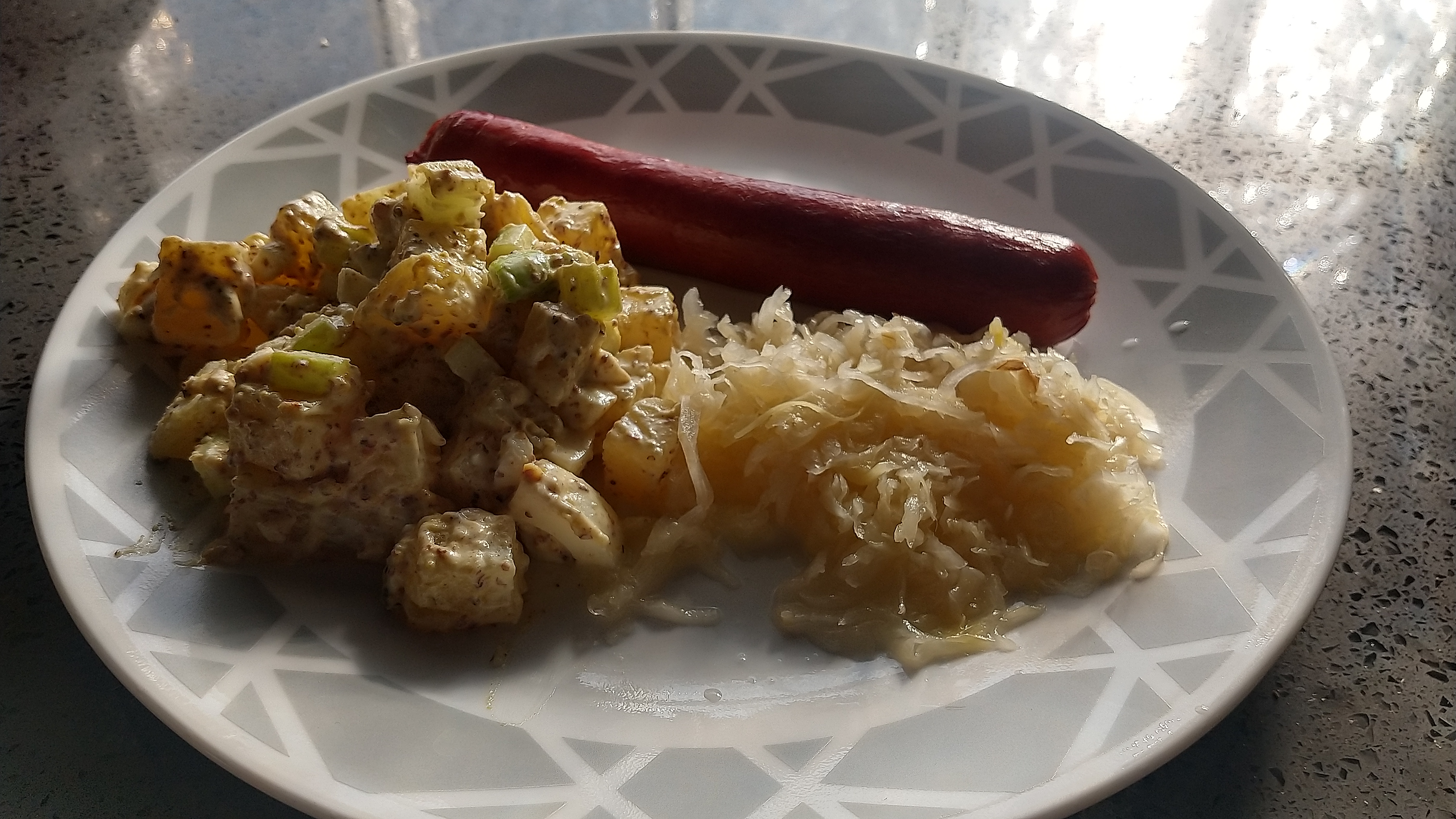 I'm certain I messed up somewhere while making the salad, but I still think it tastes great. The eggs have proven a nice touch, giving a softer texture to contrast the firmer potatoes. You can never go wrong with sauerkraut on a hotdog, although I will admit the presence of the kraut kinda makes the mustard part feel redundant. The wiener was kind of basic, I'll have to see about getting my hands on some higher quality meat in the future.