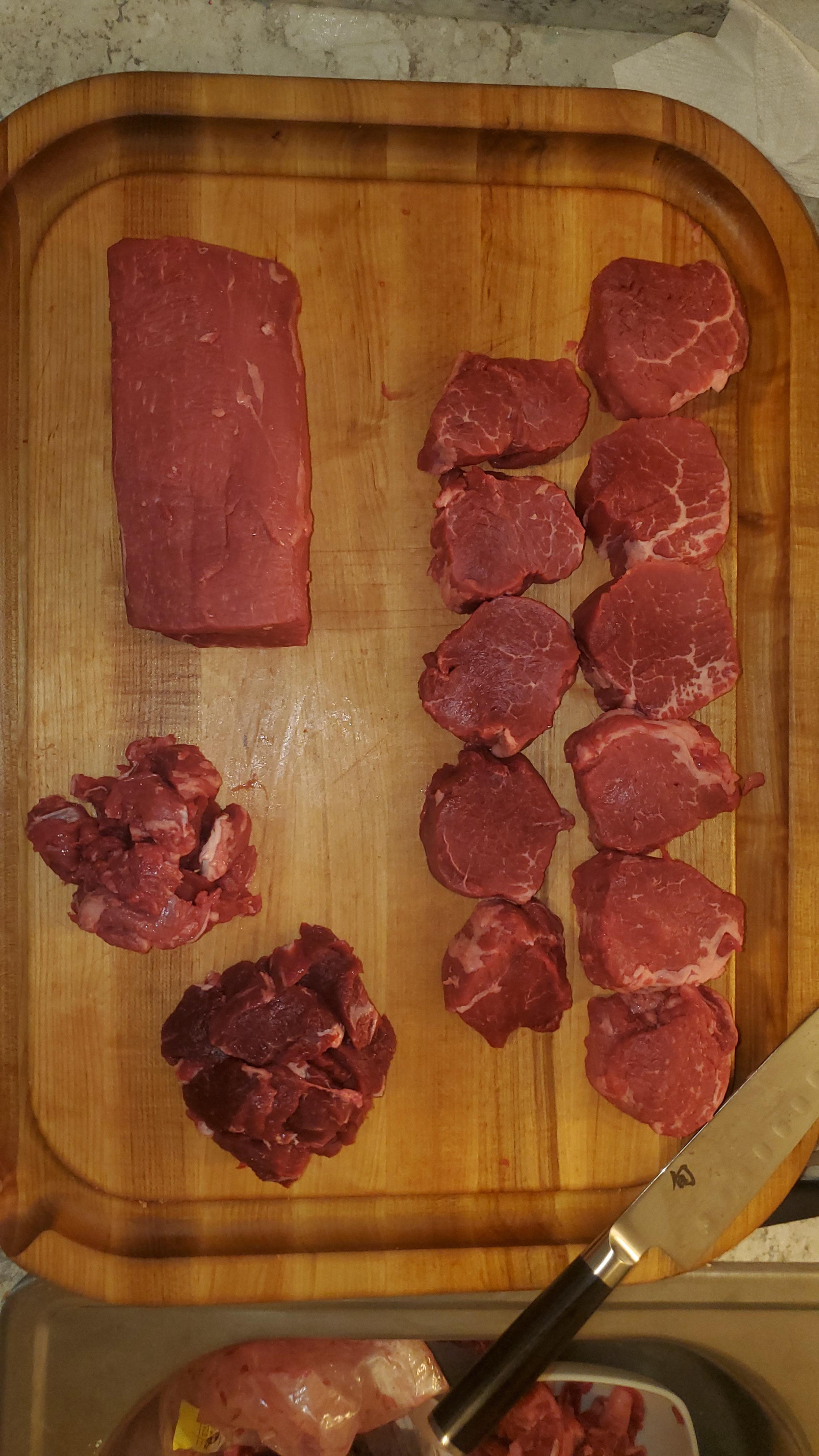 Cut up and trim thusly. 26.88 oz chateaubriand, 6 filet, 5 petite filet, Bear (dog) snacks