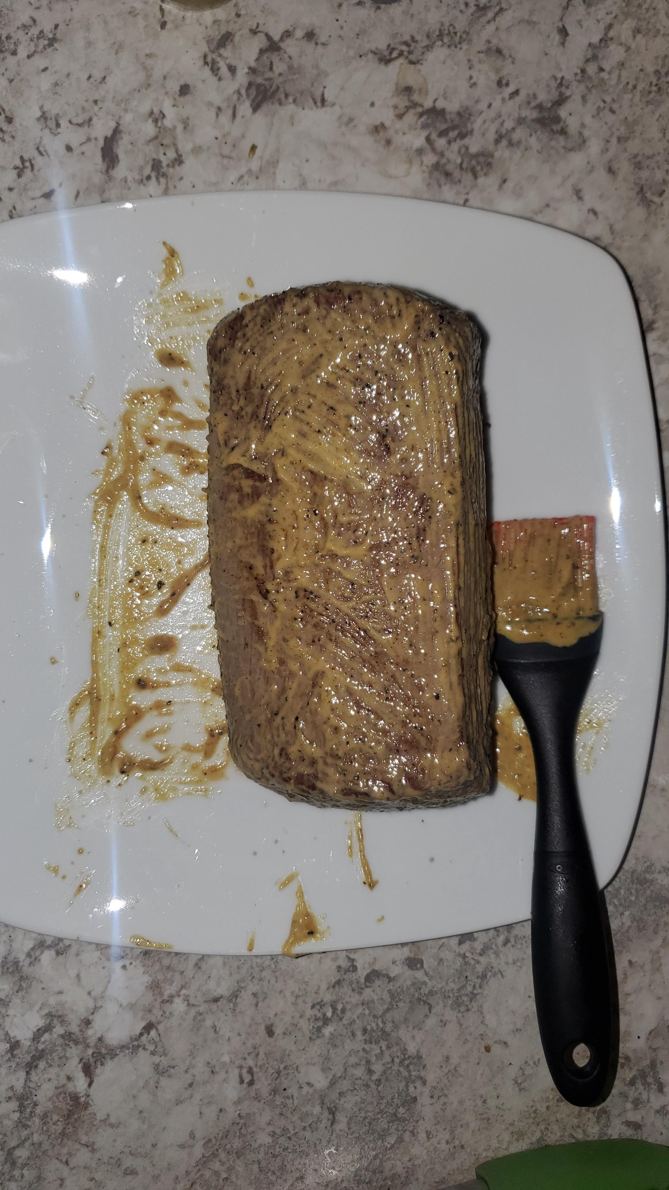 Cook in oven at 425* with a probe temp on the side. Cook till done at 125 for Medium Rare. Cover the top in flaked salt. That is a 12 Brisket slicer for size reference.