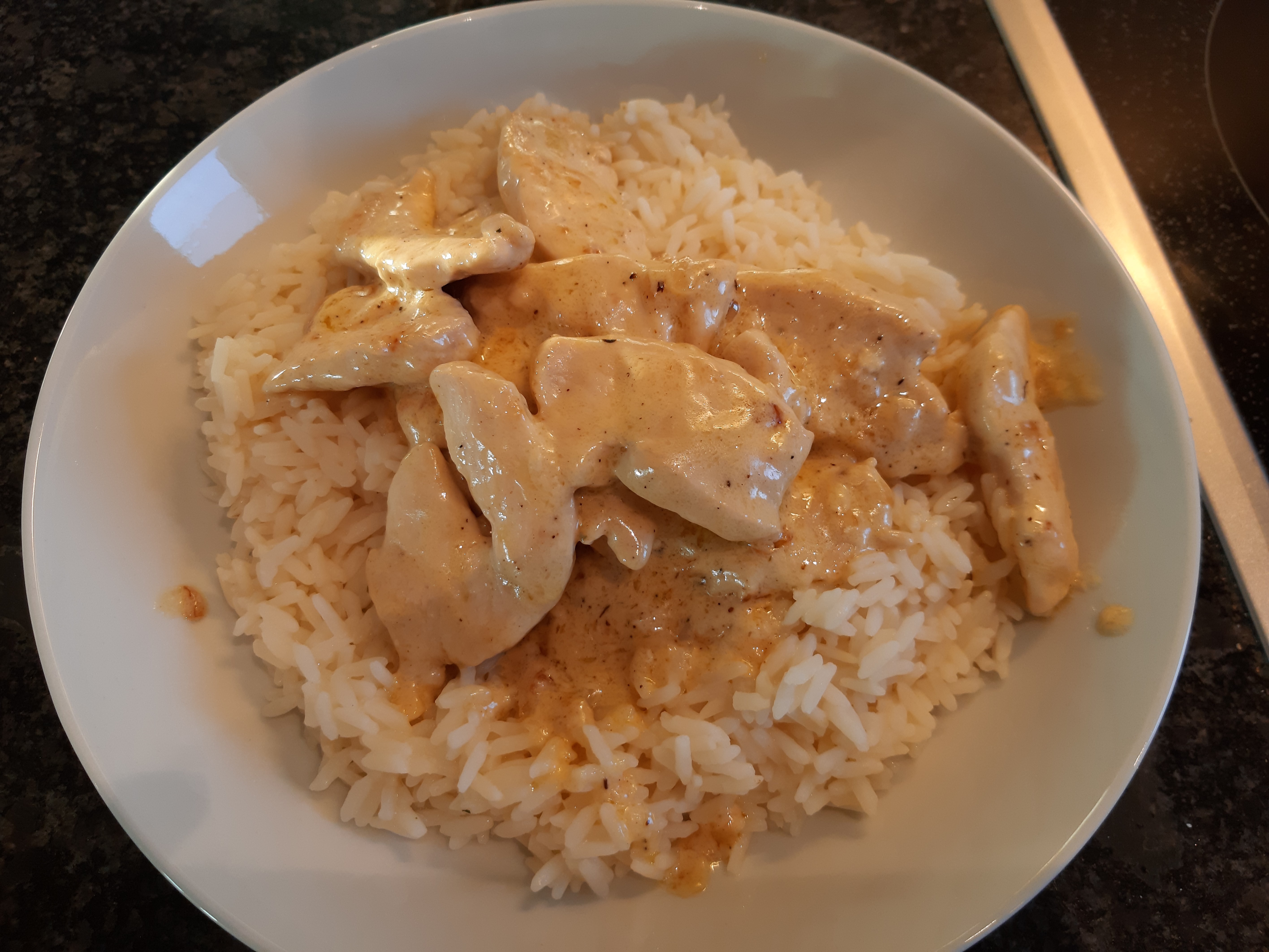Fry 300 g chicken. Put it away. Fry half an onion. Add 1 dl chicken broth, let it thicken a little. Add 100 g crème fraîche and three tablepsoons of lemon juice. Let it boil, then simmer and add 1/1 teaspoon corn starch dissolved in 1 tablespoon of water. Add the chicken, season (salt, pepper, thyme) and let it simmer for 4.5 minutes.