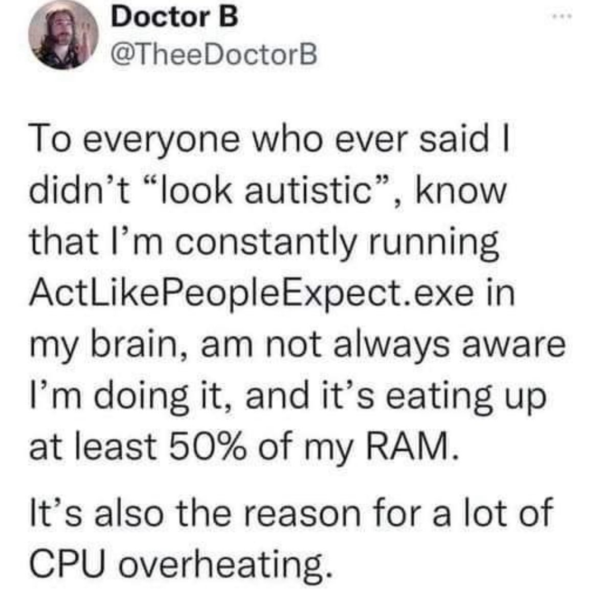 #10 The other night I was at dinner with coworkers and running EnsureNobodyFeelsLeftOut.exe the whole time. "X isn't interested in this topic, it's rude if I realize that and don't try to fix it but also rude if I disrupt J & S, who ARE engaged in this conversation. I don't want to invalidate them, so what do I say that can gently transition us to a new topic without anyone realizing that's what I'm doing?" Calculating every word, analyzing every reaction. Masking is exhausting.