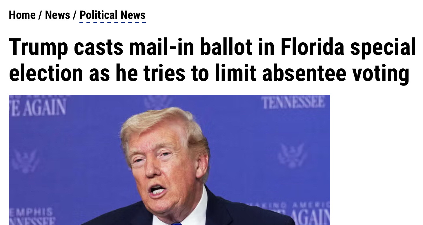 Calls voting by mail cheating, then votes by mail despite being in Florida all the time. Trump cares about Trump and wants you to believe his bullshit.