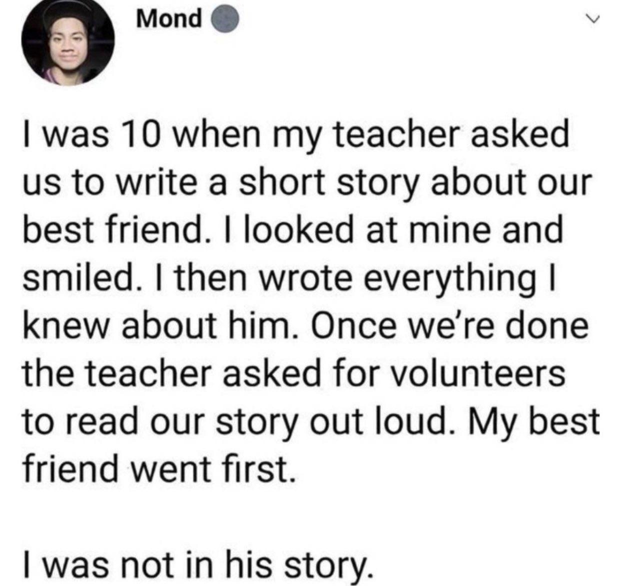 We did this in our class as well. The point of the lesson is your perception of events is only from your point of view and can differ from others. Not everyone thinks the way you do. It was a hard lesson. Kids cried. It’s one of the few lessons I still think about from that 3rd grade class and it was over 40 years ago.