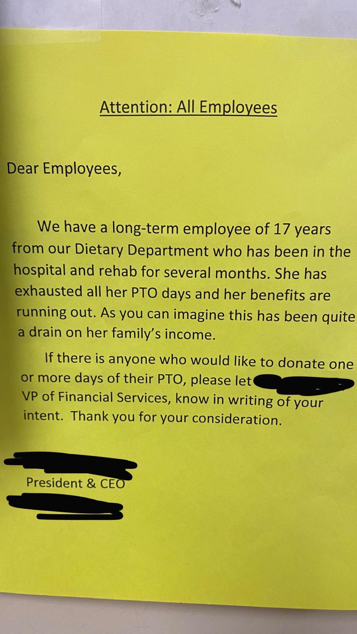 This actually happened at a place I used to work at. Coworker was in a coma. Employees were asked to donate their PTO. None was given freely