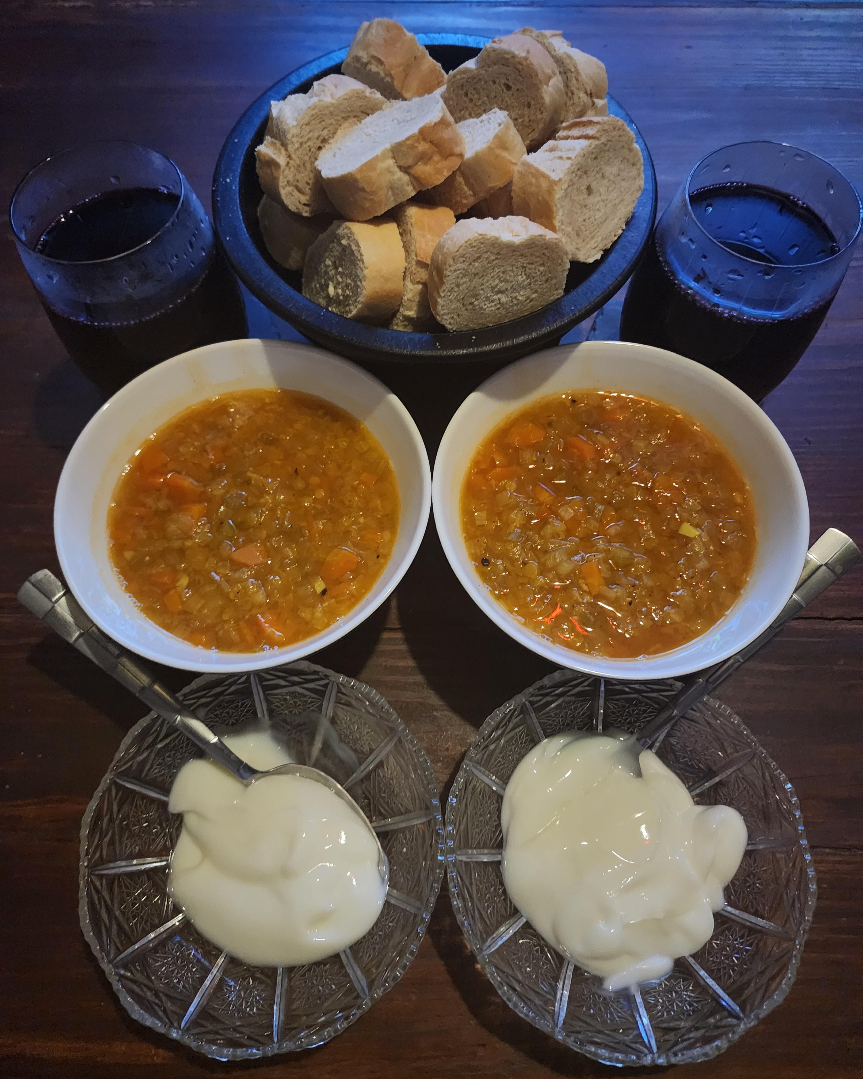 Traditional Scottish version is anything but bland. Replace veg stock with ham stock and or diced bacon. Better yet boil a ham hough for an hour and tease the meat off. Nom nom