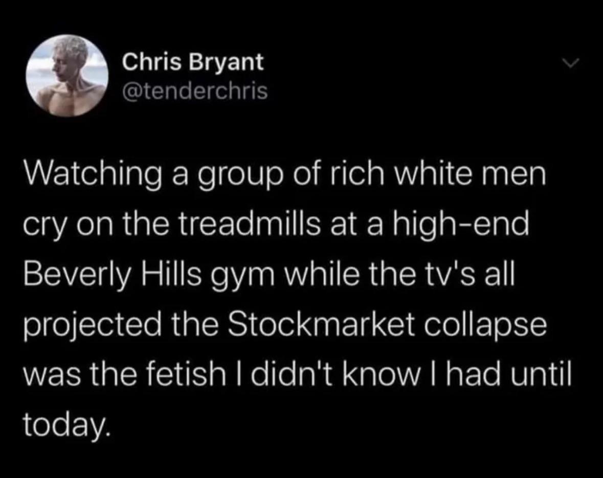 I need to be clear on this, the market is run by ALGORITHMS that monitor social media and make decisions based on what dipshits like Musk and Tr*mp tweet, because the market is a stupid fantasy for rich assholes, and we live in hell.