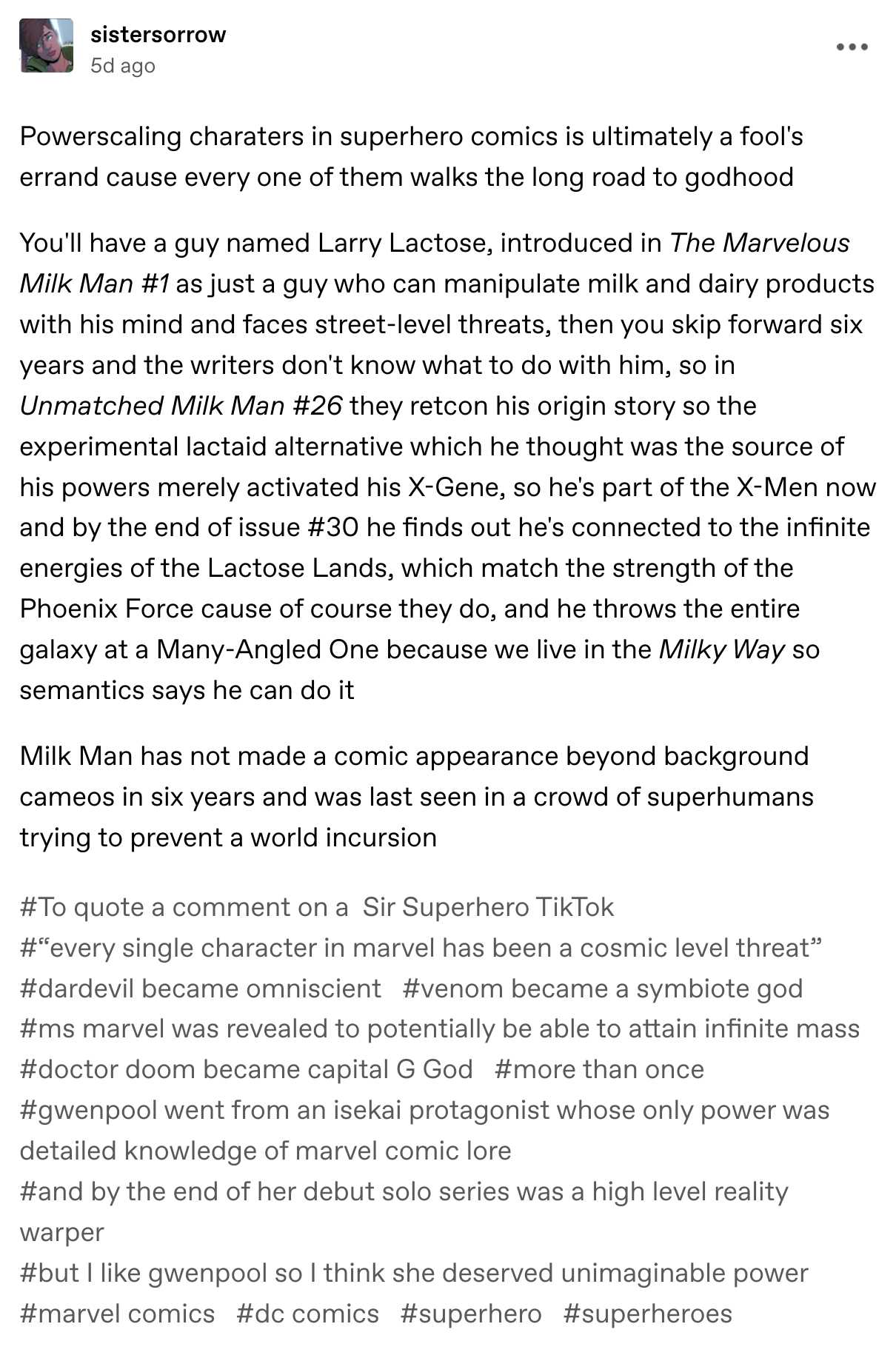 I guess thats how you can have progress in superhero comics. You can have a superhero vs supervillain conflict for some time, and you can add other antagonists without power creeping the hero, but eventually it gets repetitive and boring. And the only way to make it cool again is to increase the scale of conflict. Obviously its better to end the story before you get to that point, but the superhero comics industry doesnt like that stuff apparently