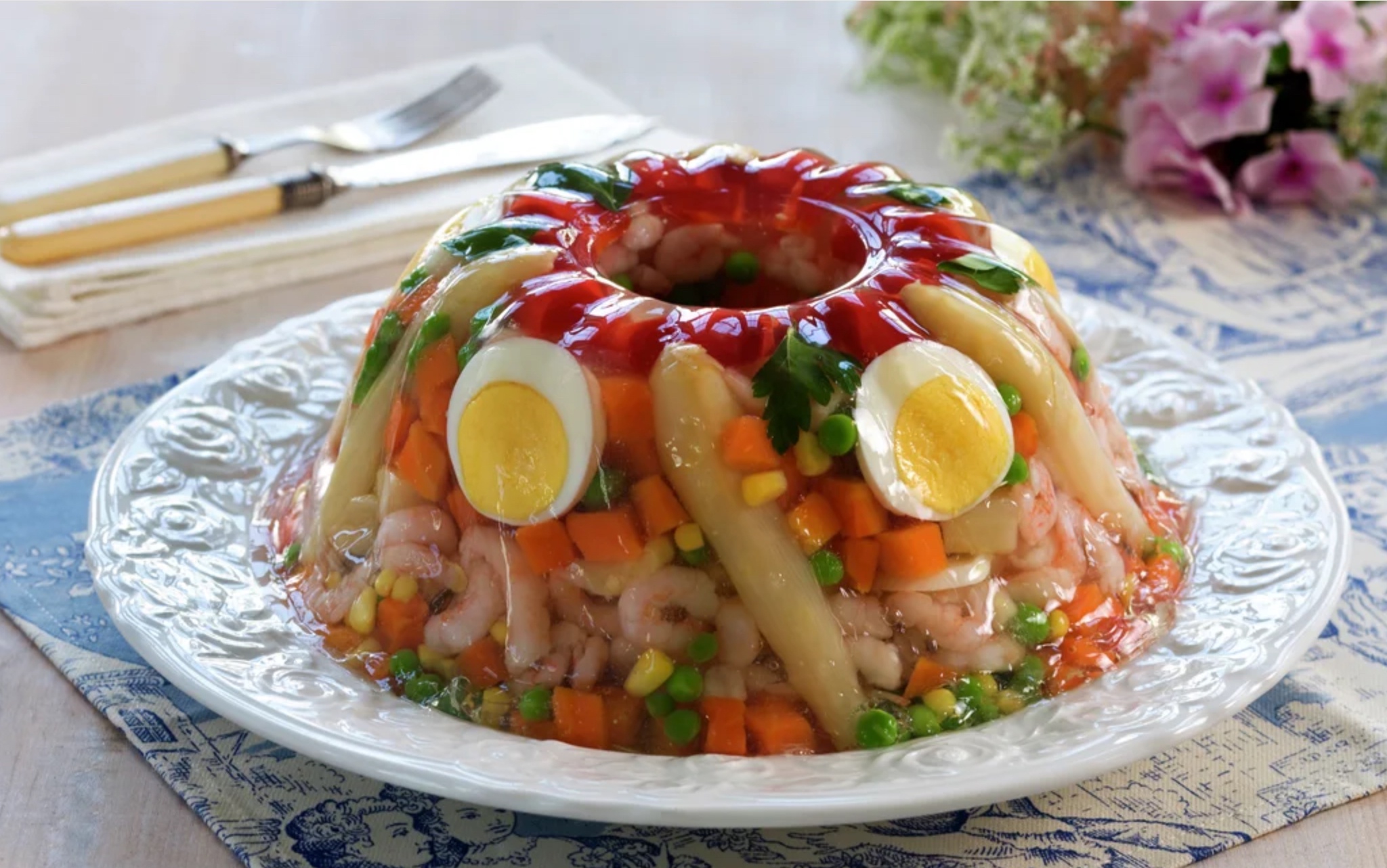 I just want to put this here as aspic can be tasty, and not like this photo. Local East European restaurant does "holodets" with chicken and it's delicious. Example: https://natashaskitchen.com/ukrainian-aspic-recipe-kholodets/ This photo - definitely an abomination. I cannot even imagine how shrimp would taste in combination of everything else here.