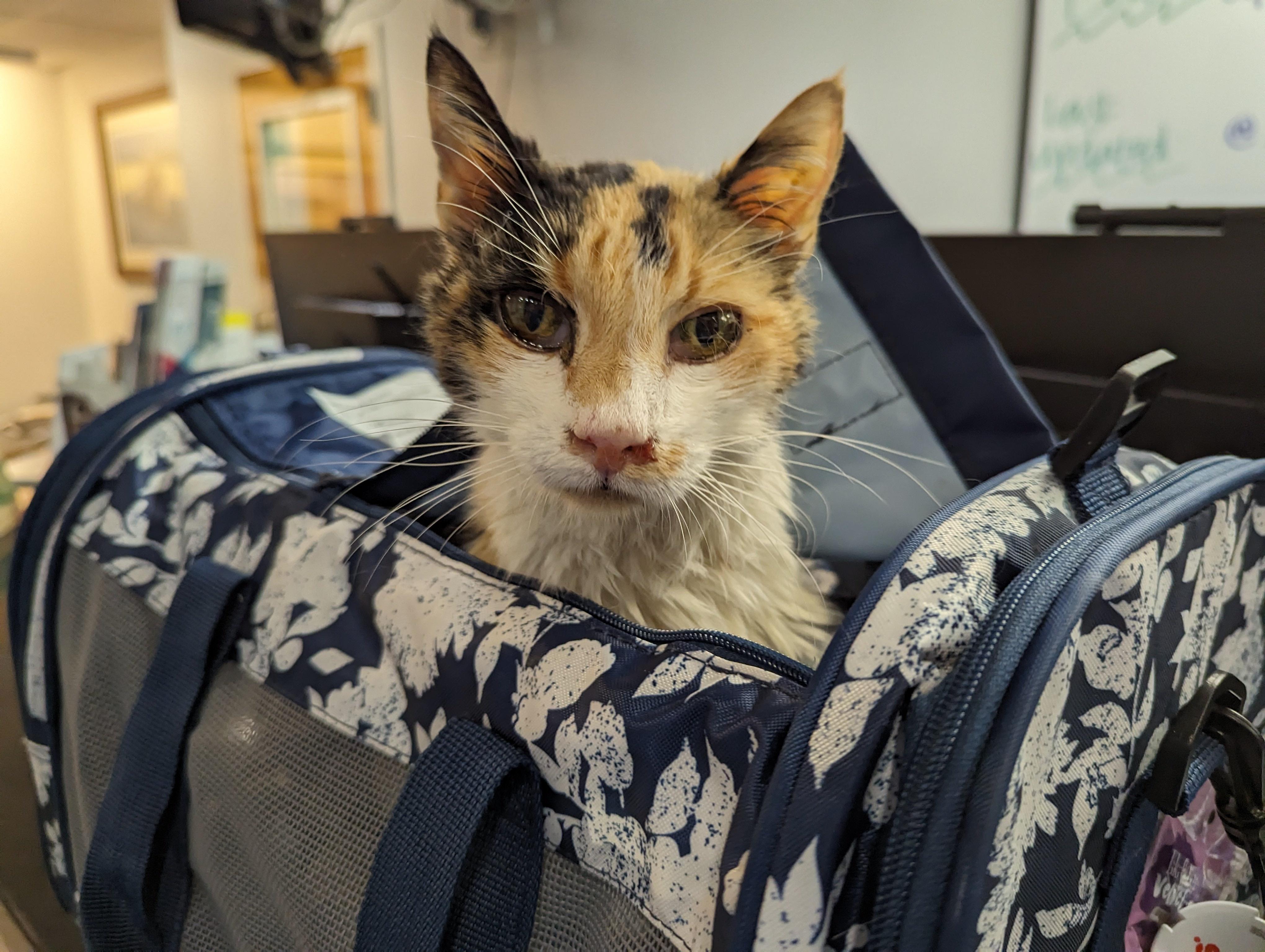 The owner's mom climbed a ladder to grab meowing blob off roof. Gently! But very 'why does this happen?'.